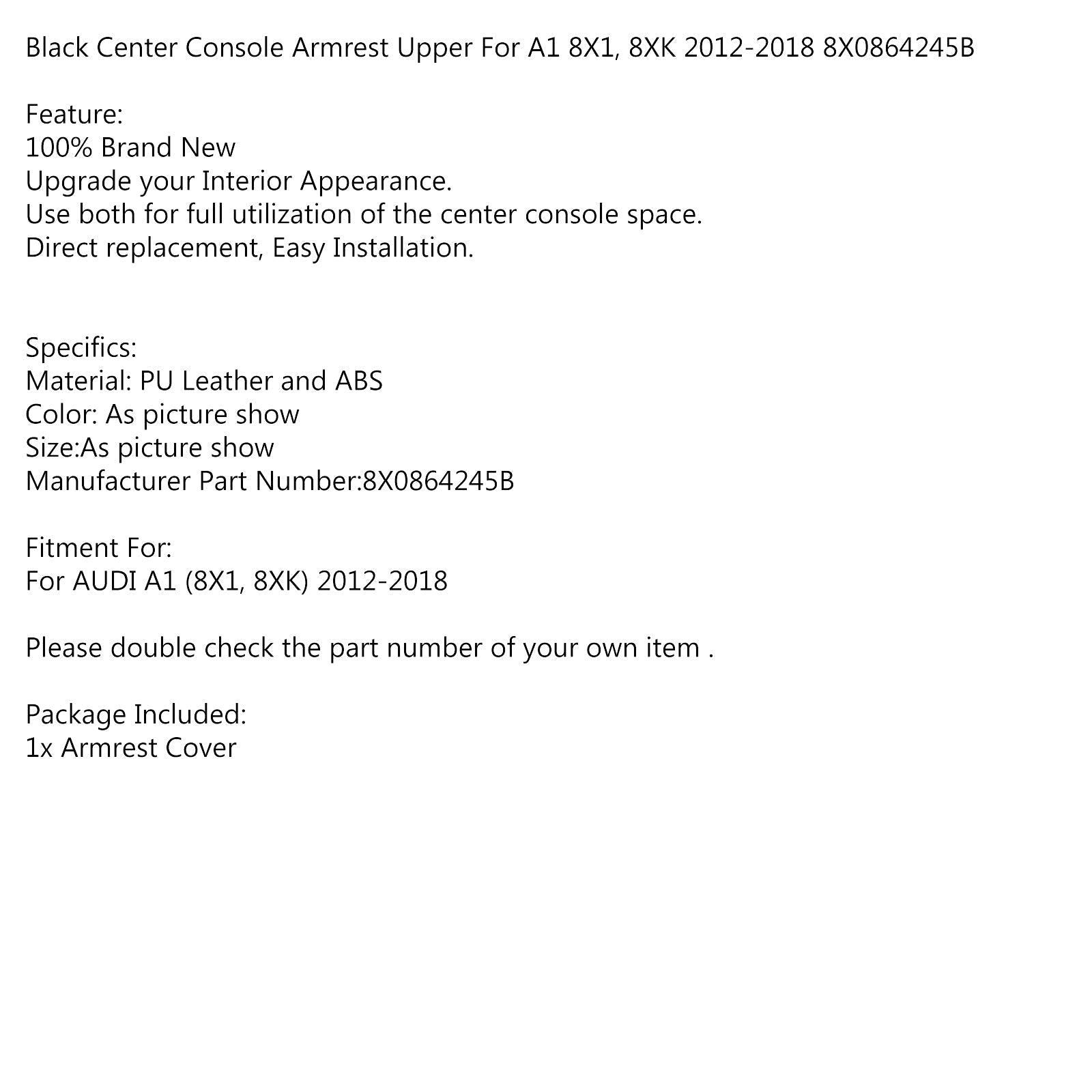 2012-2018 Audi A1 8X1 8XK 2012-2018 Center Console Armrest Upper 8X0864245B Black