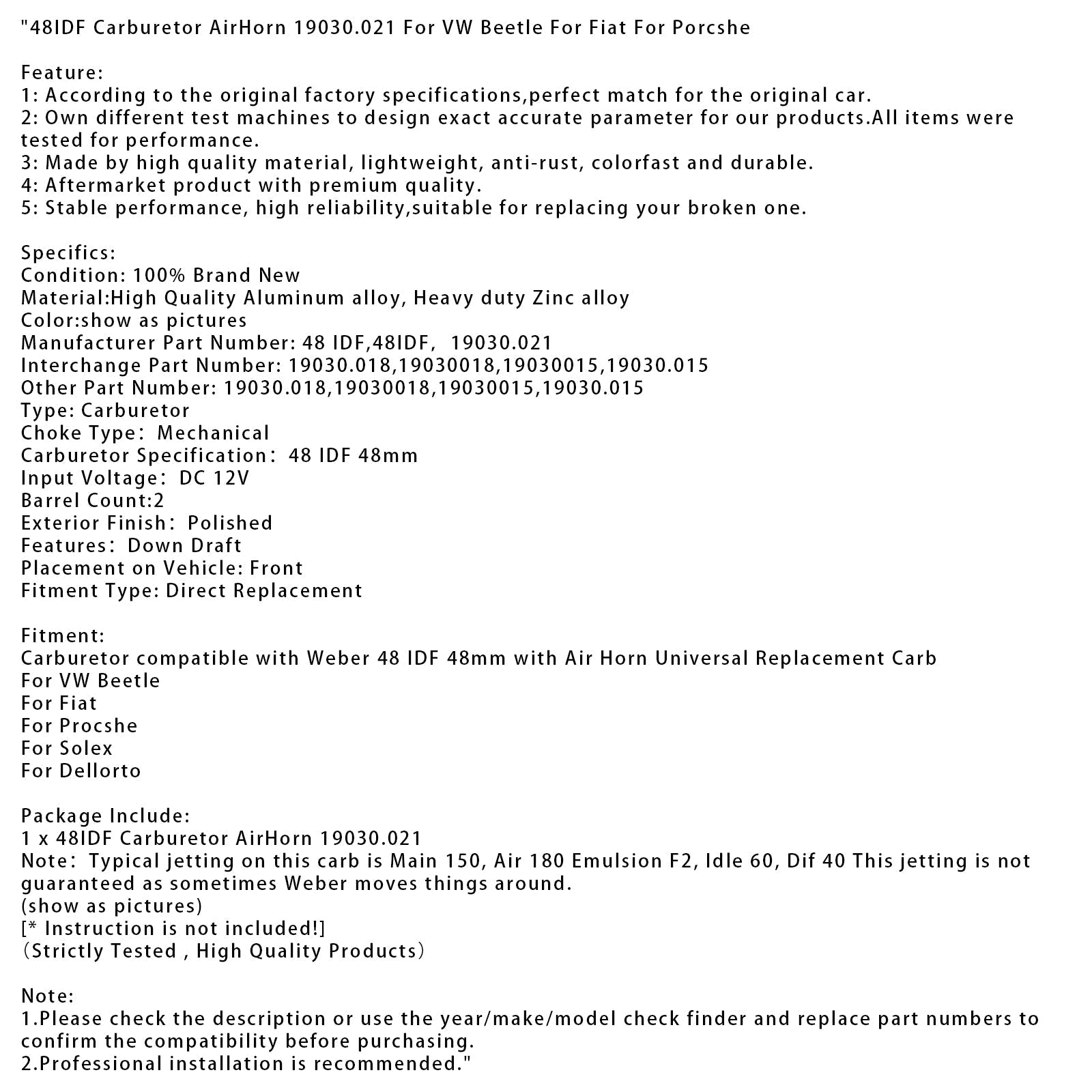 Carburetor compatible with Weber 48 IDF 48mm with Air Horn Universal Replacement Carb