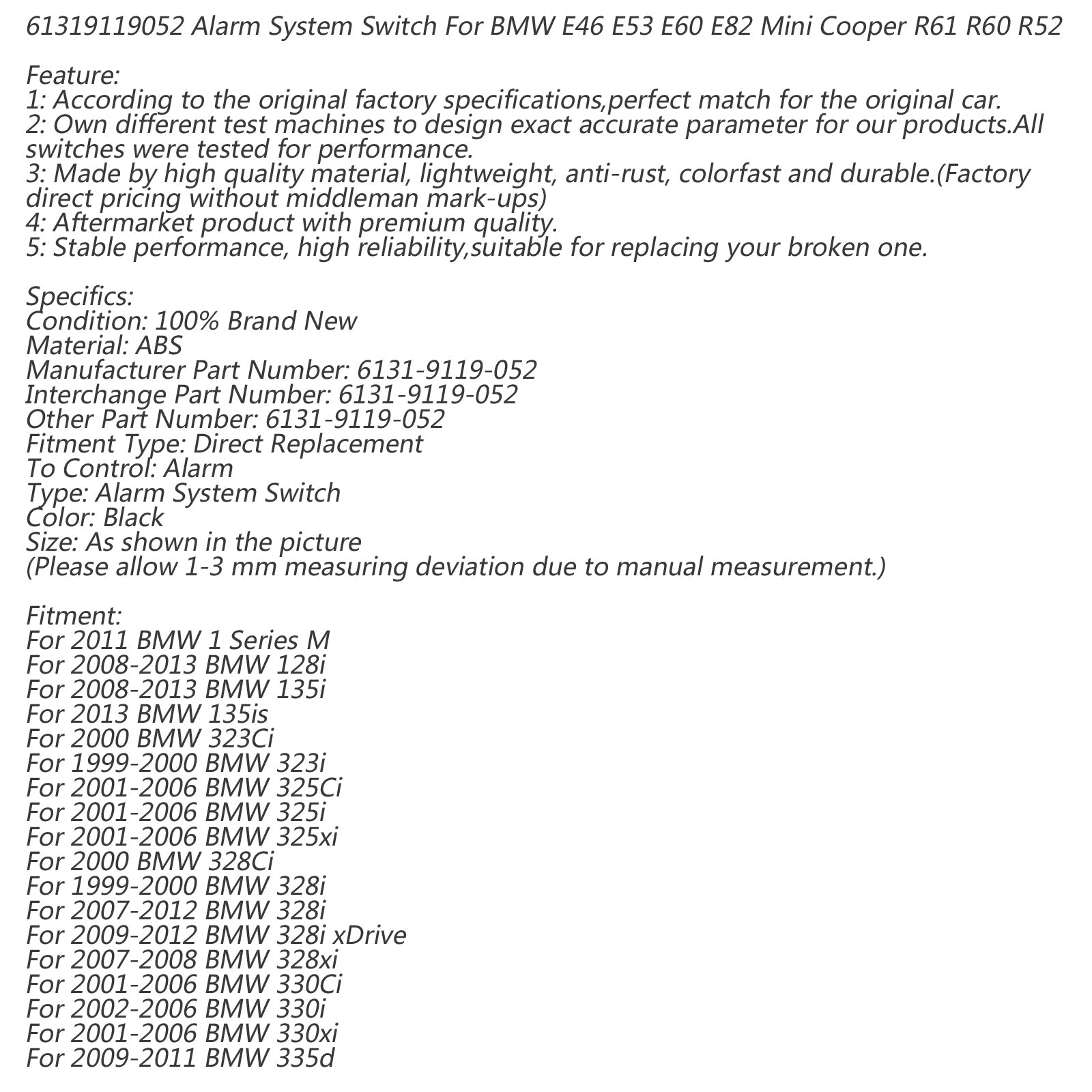 61319119052 Alarm System Switch For BMW E46 E53 E60 E82 Mini Cooper R61 R60 R52