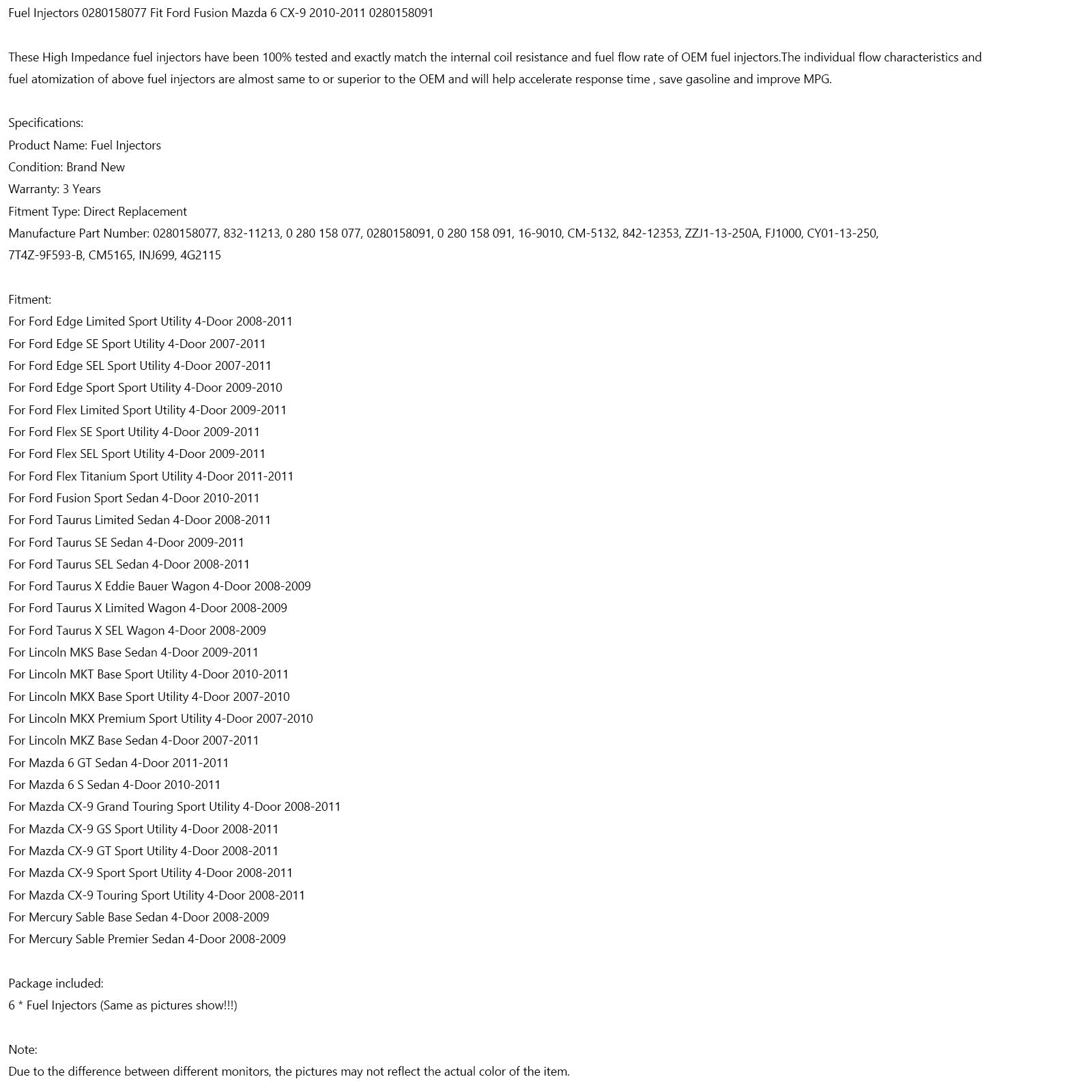 6PCS Fuel Injectors 0280158077 Fit Ford Fusion Mazda 6 CX-9 2010-2011 0280158091