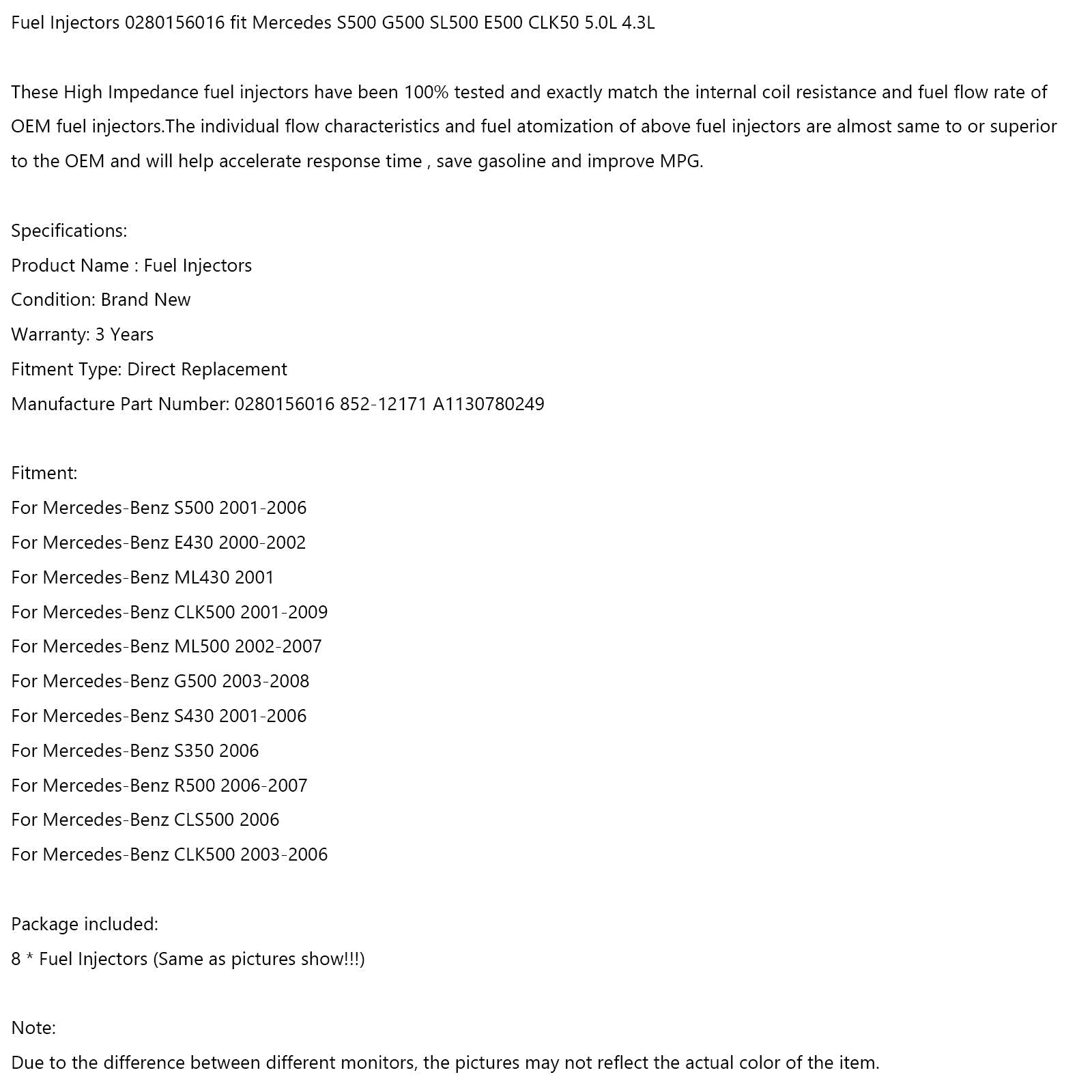 8pcs Fuel Injectors 0280156016 fit Mercedes S500 G500 SL500 E500 CLK50 5.0L 4.3L