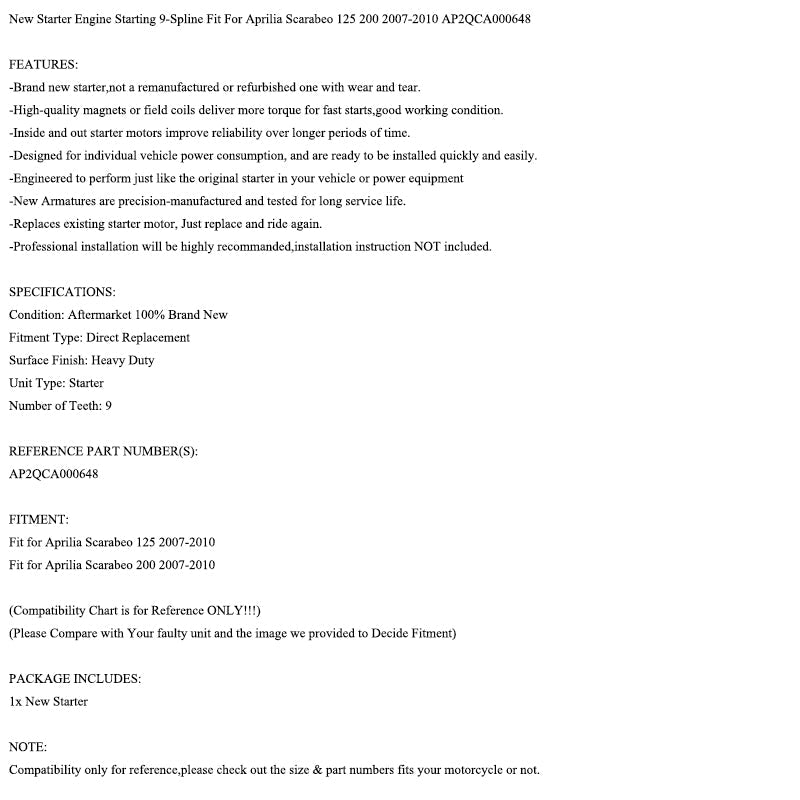 Starter Motor Fit for Aprilia Scarabeo 125 200 Light 2007-2010 AP2QCA000648