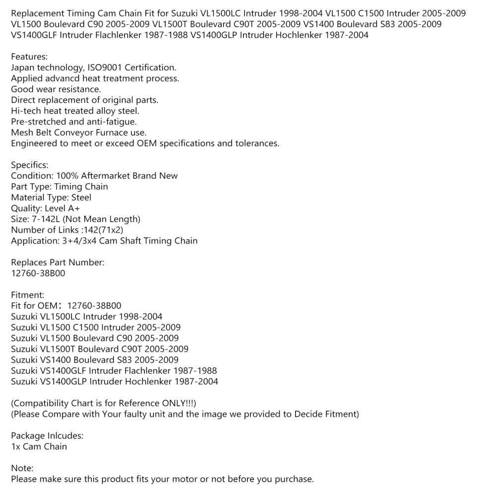Replacement Timing Cam Chain Fit for Suzuki VL1500LC Intruder 1998-2004 VL1500 C1500 Intruder 2005-2009 VL1500 Boulevard C90 2005-2009 VL1500T Boulevard C90T 2005-2009 VS1400 Boulevard S83 2005-2009 VS1400GLF Intruder Flachlenker 1987-1988 VS1400GLP Intruder Hochlenker 1987-2004