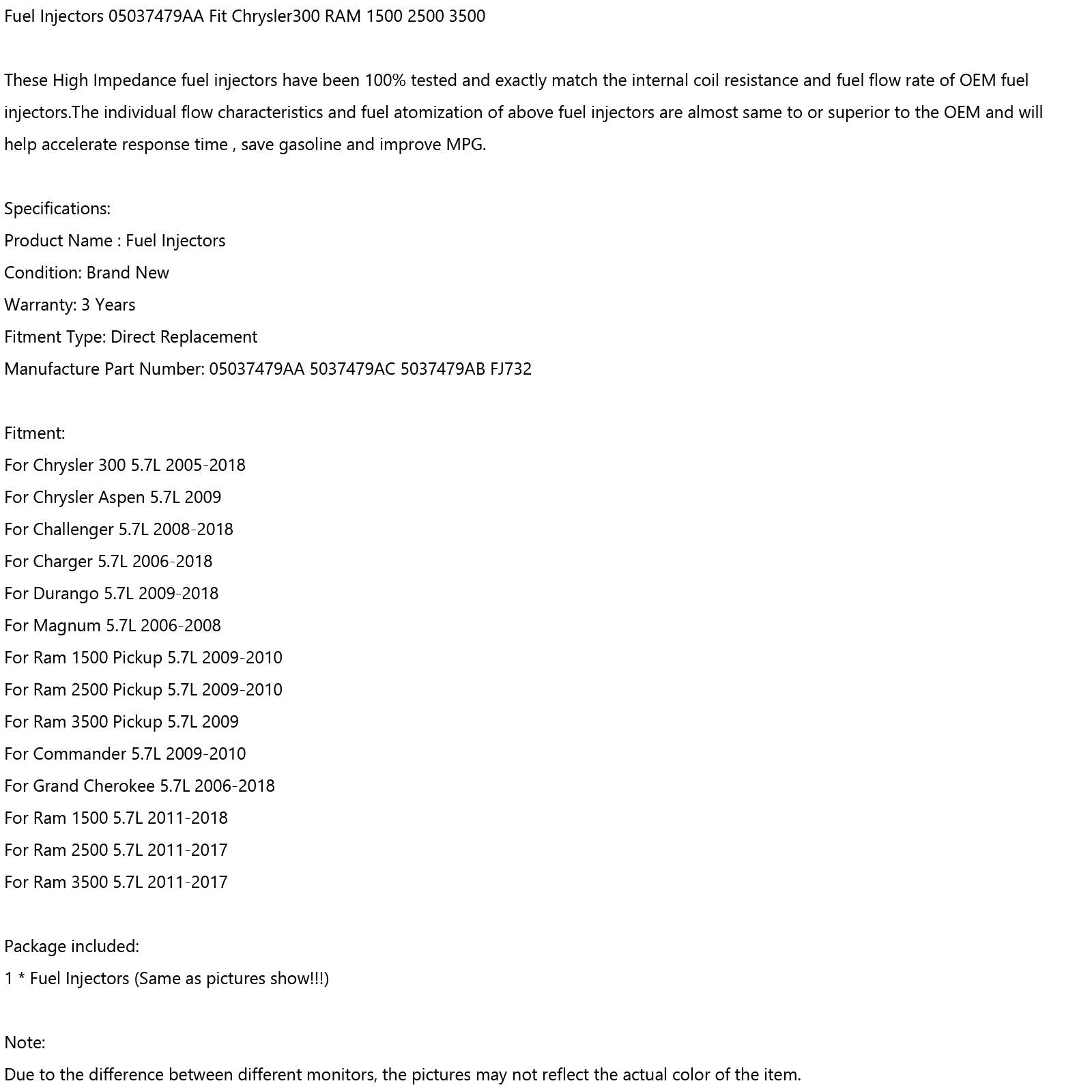 1 inyector de combustible 05037479AA compatible con Chrysler 300 RAM 1500 2500 3500 5037479AC