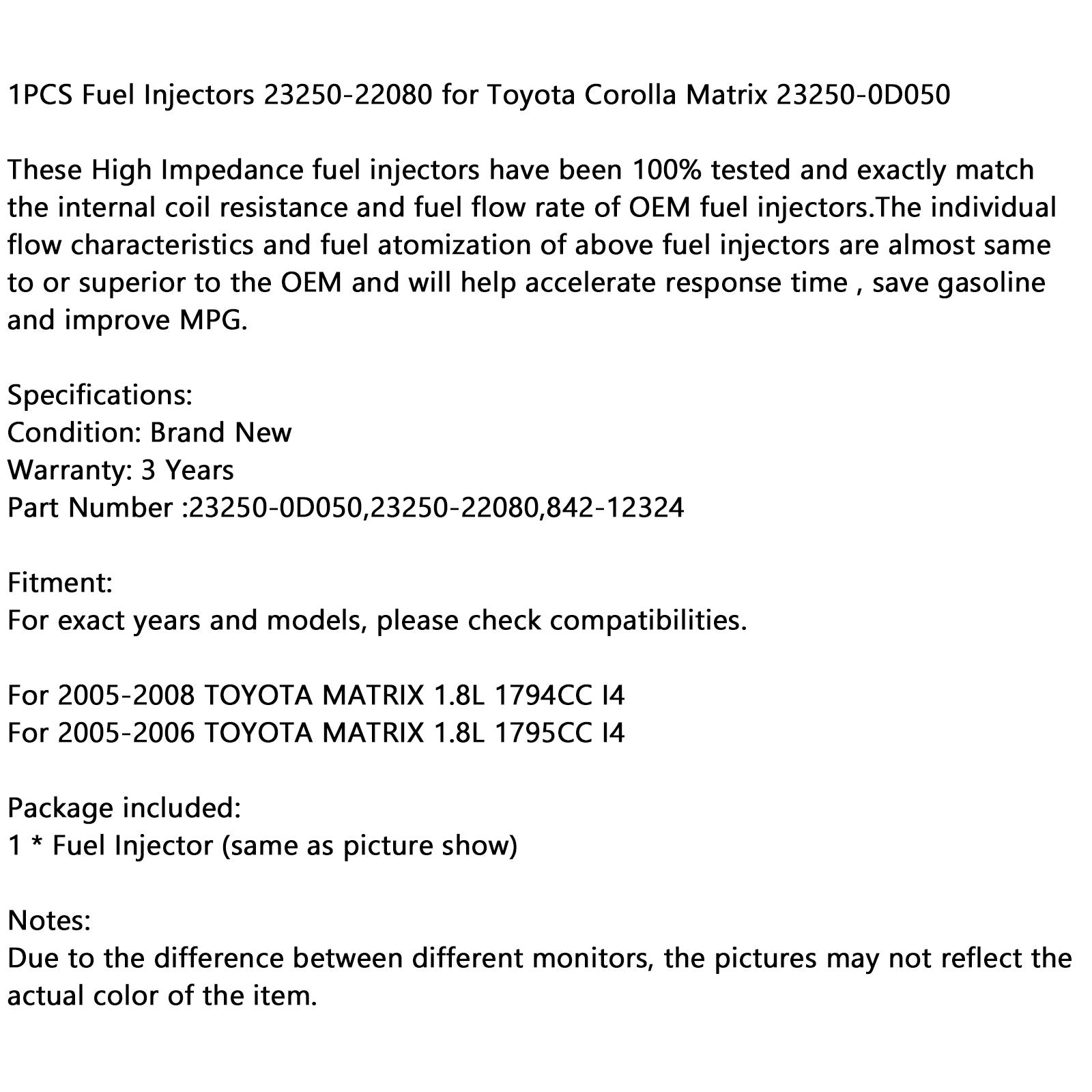 1 inyector de combustible 23250-22080 Toyota Corolla Matrix 23250-0D050