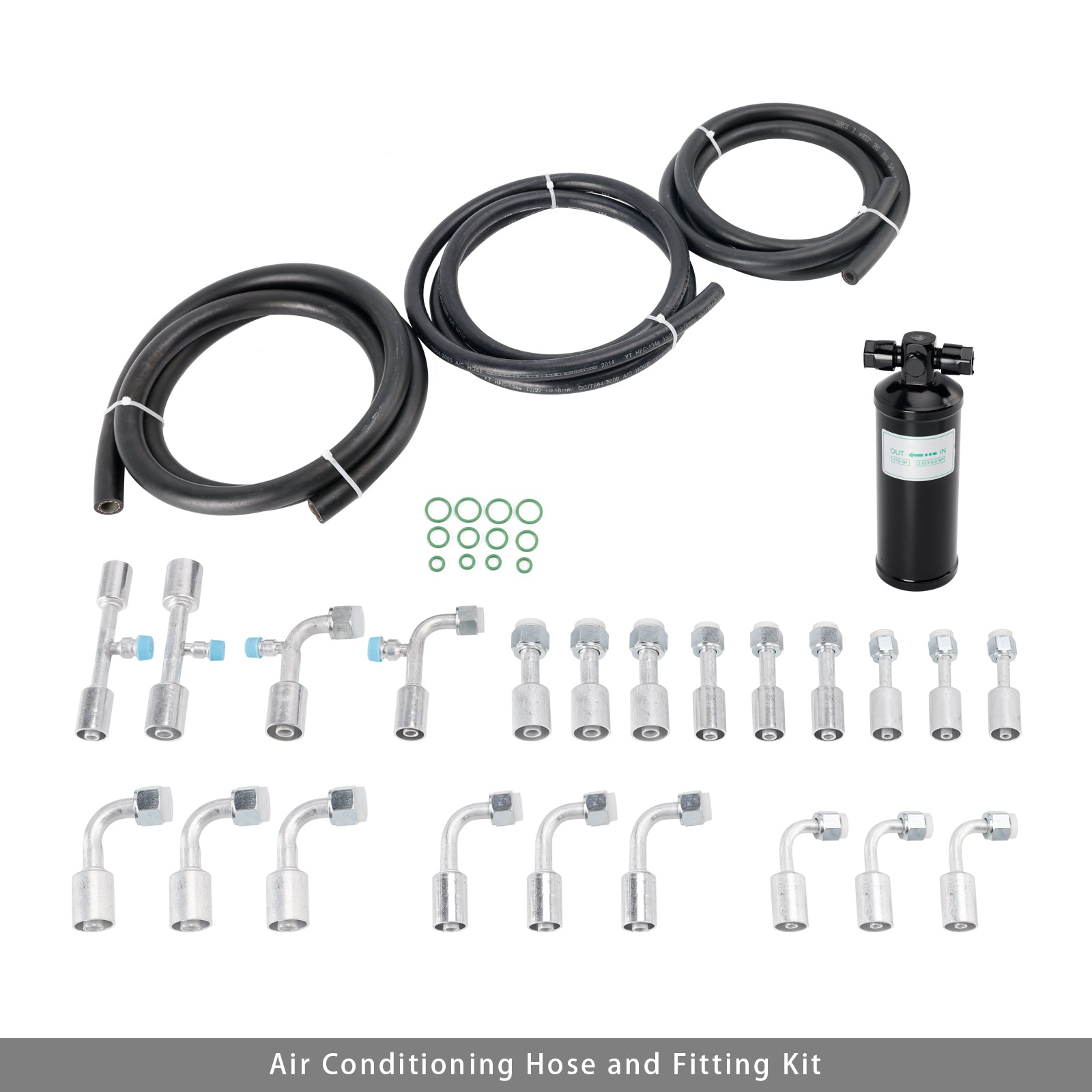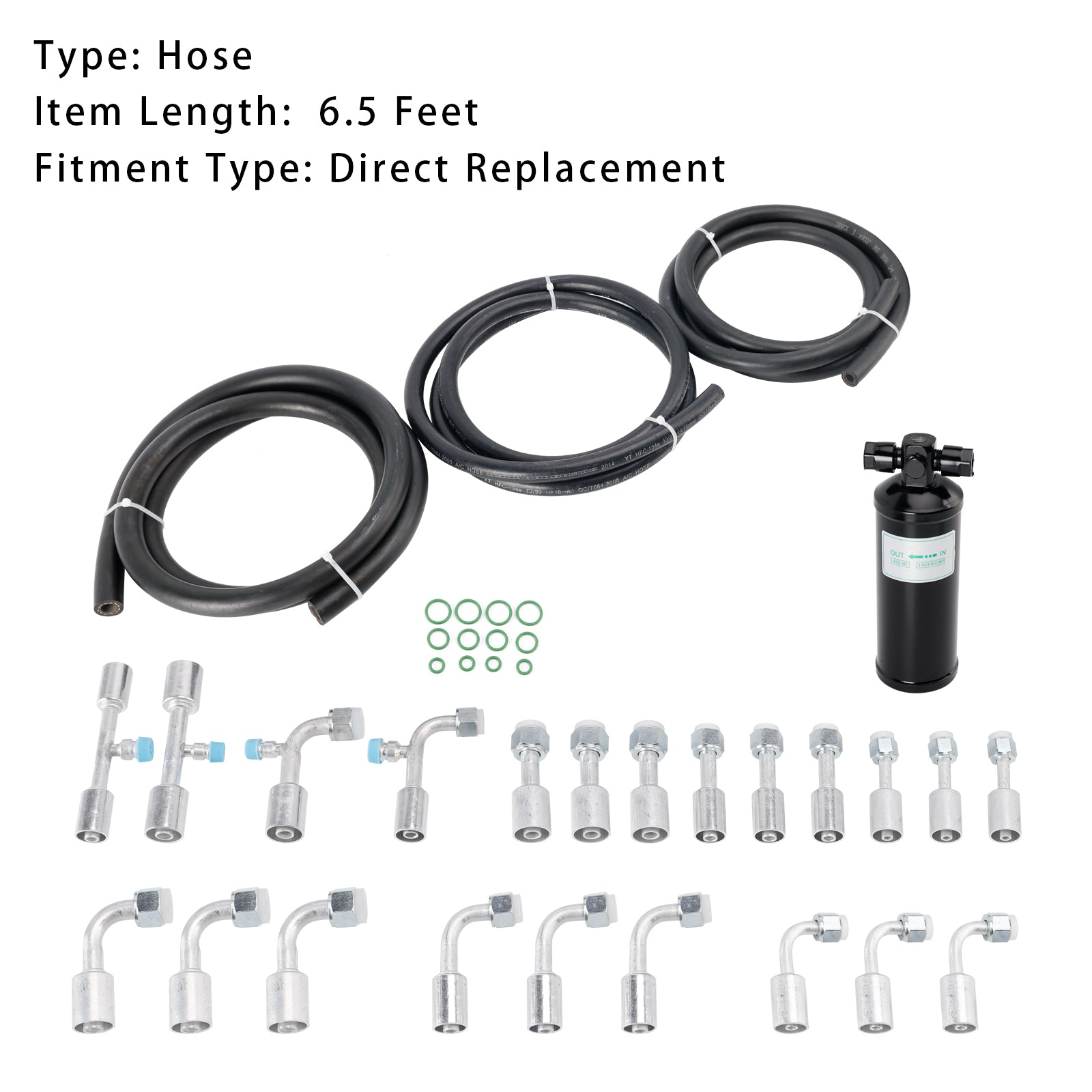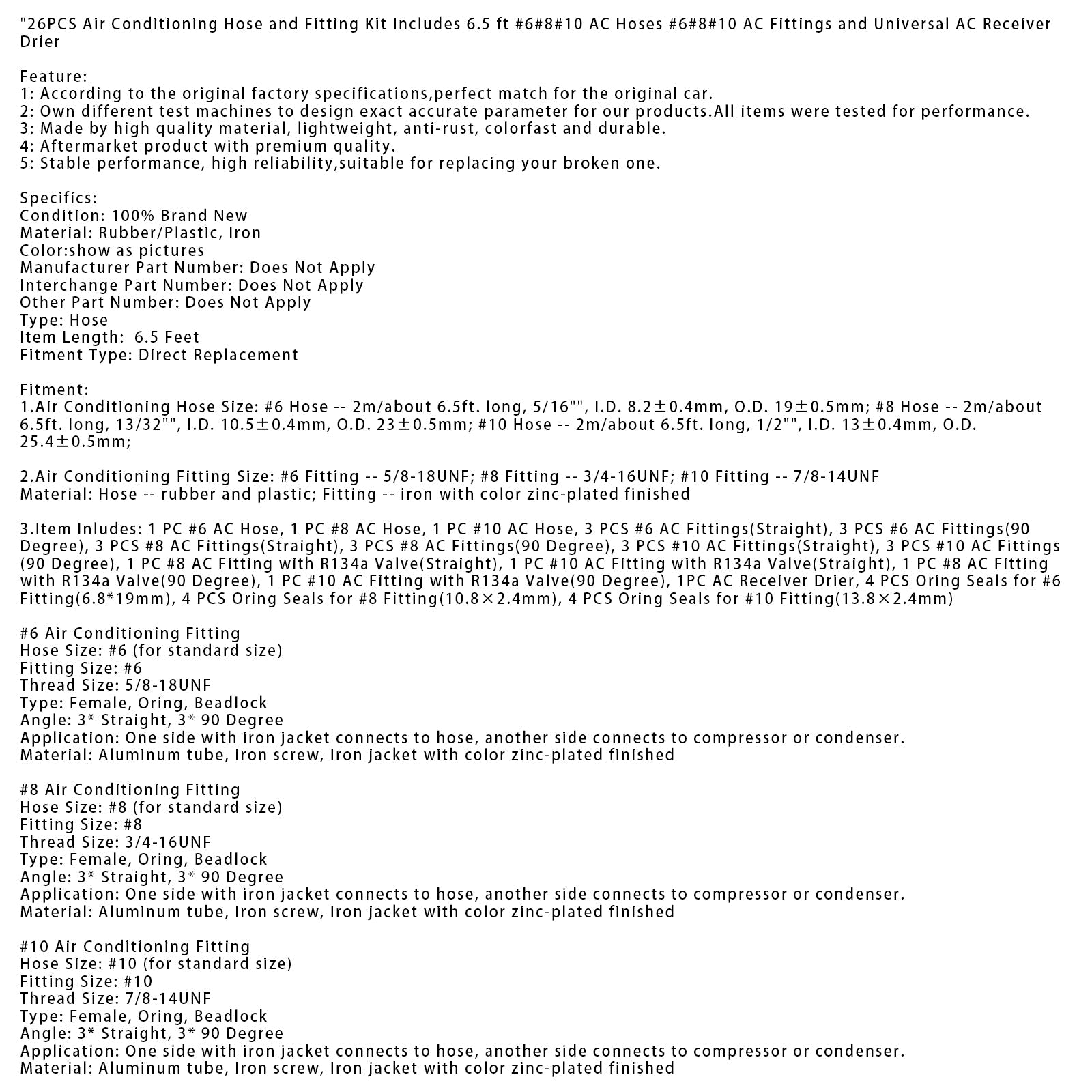 Kit de 26 mangueras y accesorios de aire acondicionado. Incluye mangueras de CA de 6,5 pies n.° 6, 8, 10, accesorios de CA n.° 6, 8, 10 y un receptor secador de CA universal.