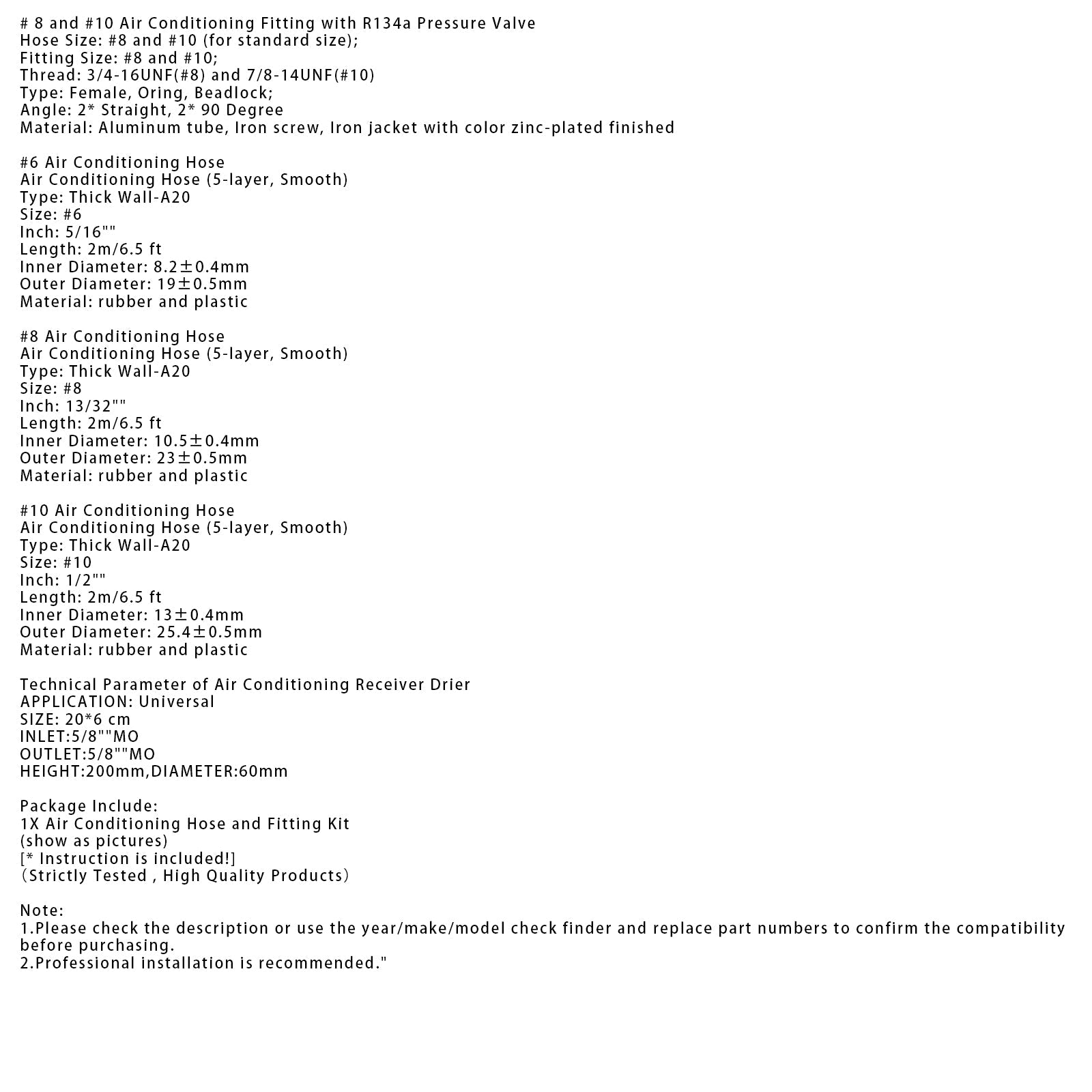 1. Tamaño de la manguera del aire acondicionado: Manguera n.º 6: 2 m/aproximadamente 6,5 pies de largo, 5/16", DI 8,2 À 0,4 mm, DE 19 À 0,5 mm; Manguera n.º 8: 2 m/aproximadamente 6,5 pies de largo, 13/32", DI 10,5 À 0,4 mm, DE 23 À 0,5 mm; Manguera n.º 10: 2 m/aproximadamente 6,5 pies de largo, 1/2", DI 13 À 0,4 mm, DE 25,4 À 0,5 mm;