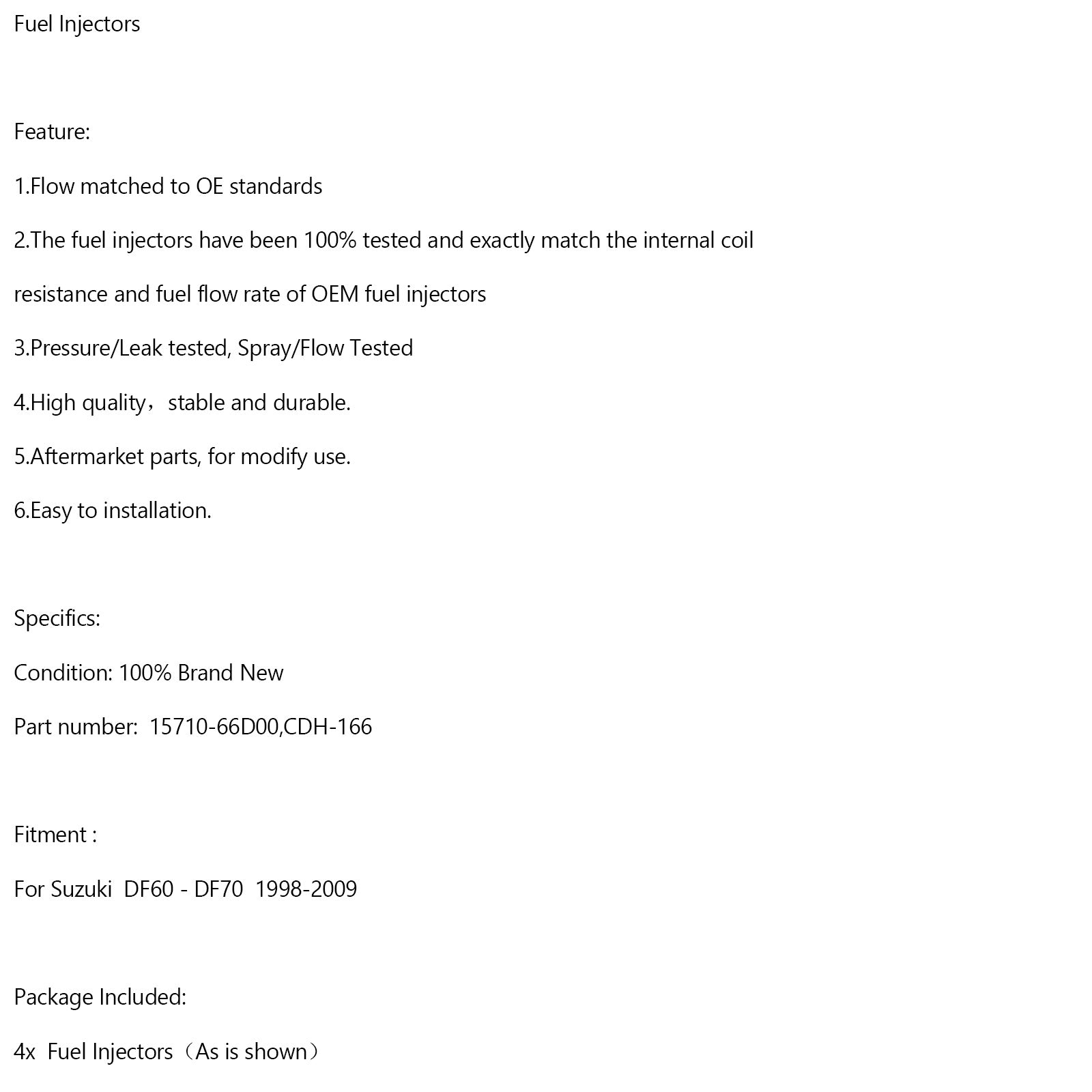 4 inyectores de combustible CDH166 15710-66D00 para Suzuki DF60-DF70 (1998-2009)