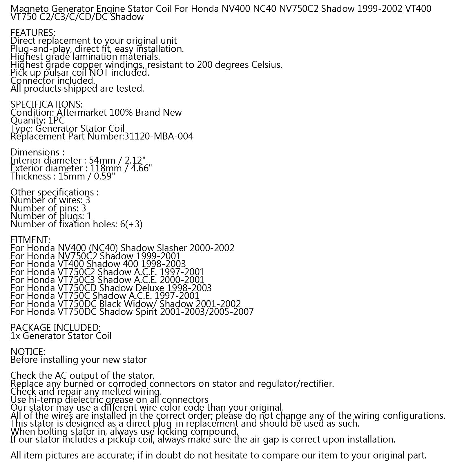 Bobina del estator del alternador para Honda NV750 C Shadow NV400 VT400 97-03 31120-MBA-004
