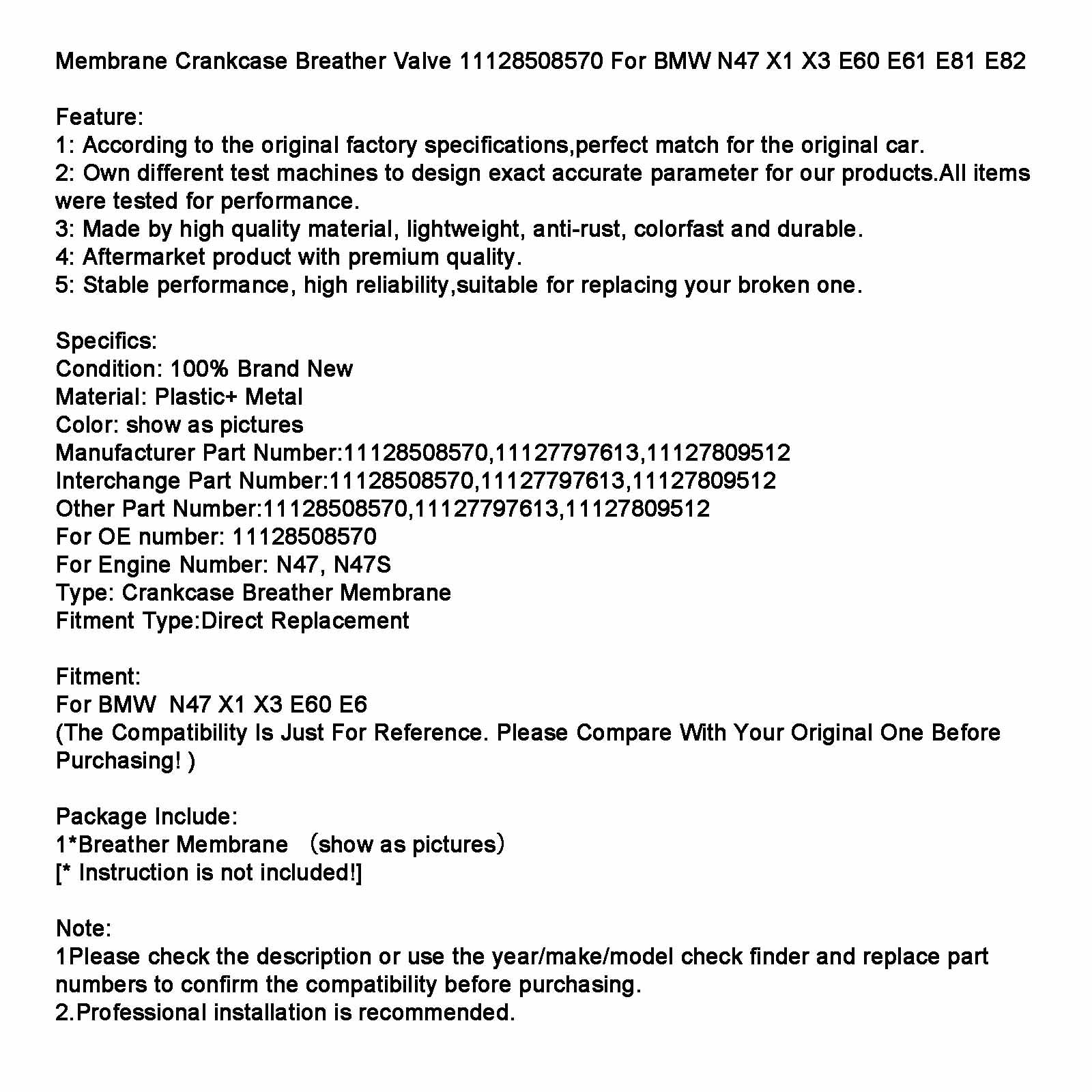 Válvula de ventilación del cárter de membrana 11128508570 para BMW N47 X1 X3 E60 E61 E81 E82