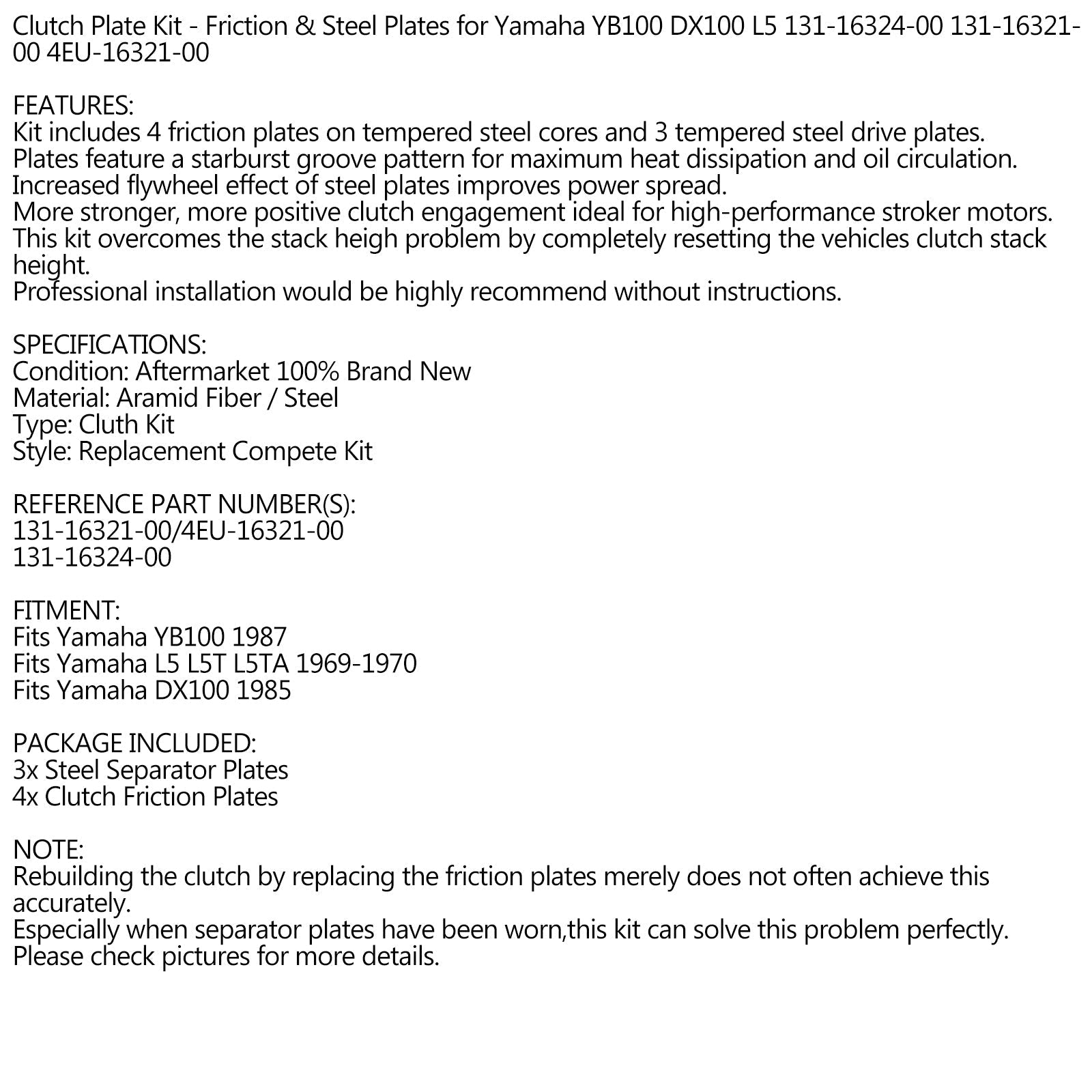Kit de discos de embrague - Discos de fricción y acero para Yamaha YB100 DX100 L5 131-16324-00 131-16321-00 4EU-16321-00