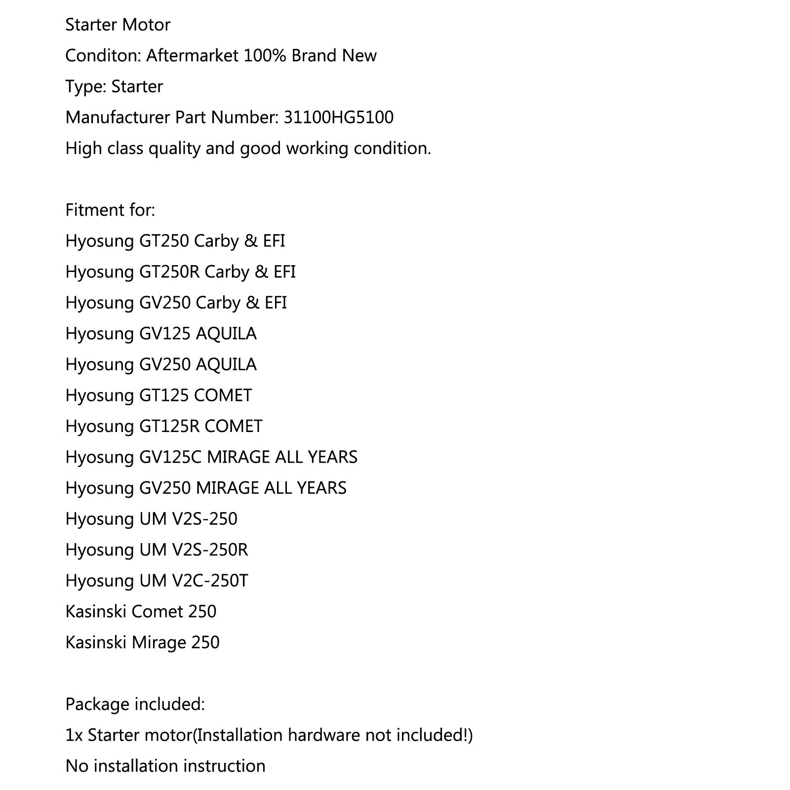 Arranque de motor para Hyosung GT250 Carby y EFI GT125R COMET Kasinski Mirage 250 Assosary