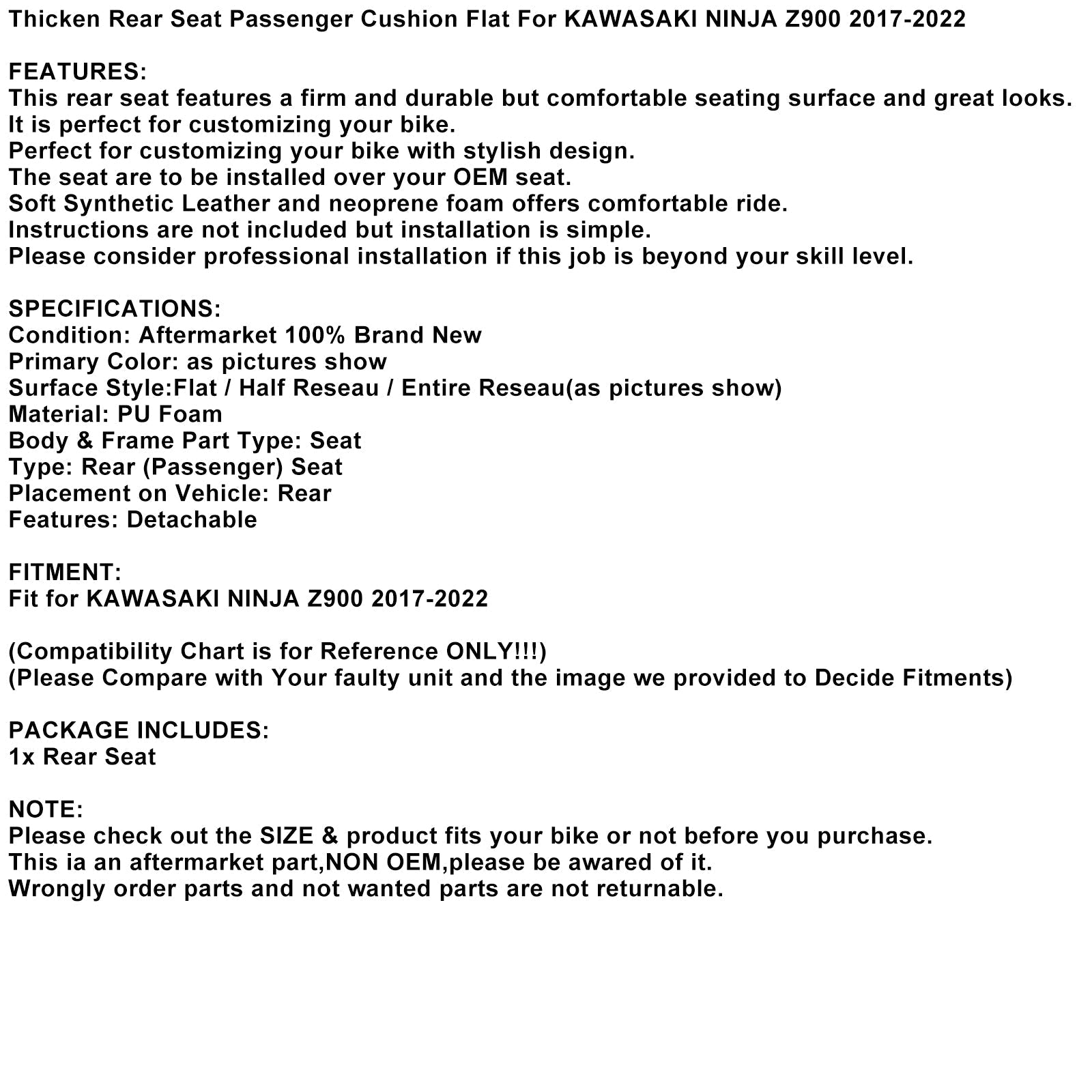 Cojín plano para asiento trasero de pasajero para Kawasaki Ninja Z900 (2017-2022)