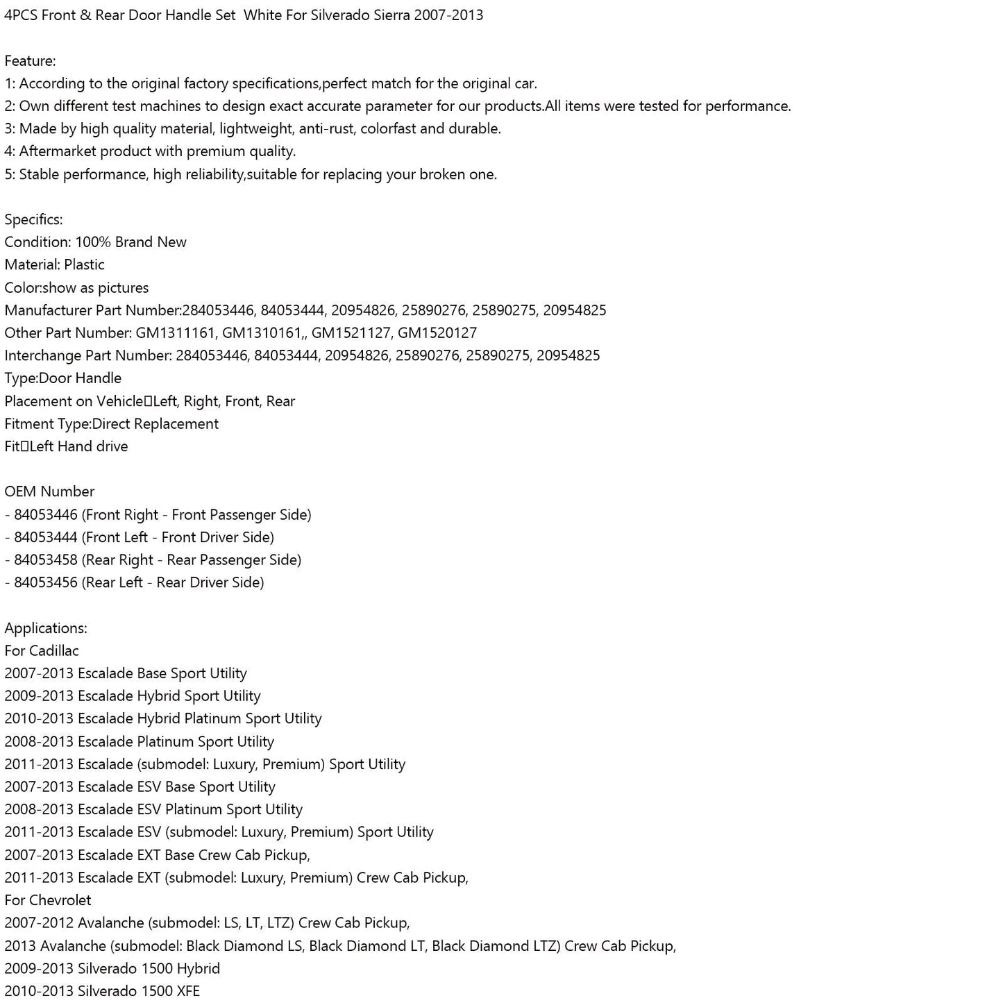 Ensemble de 4 poignées de porte avant et arrière blanches pour Cadillac Escalade Base Sport Utility 2007-2013 (284053446, 84053444, 20954826, 25890276)