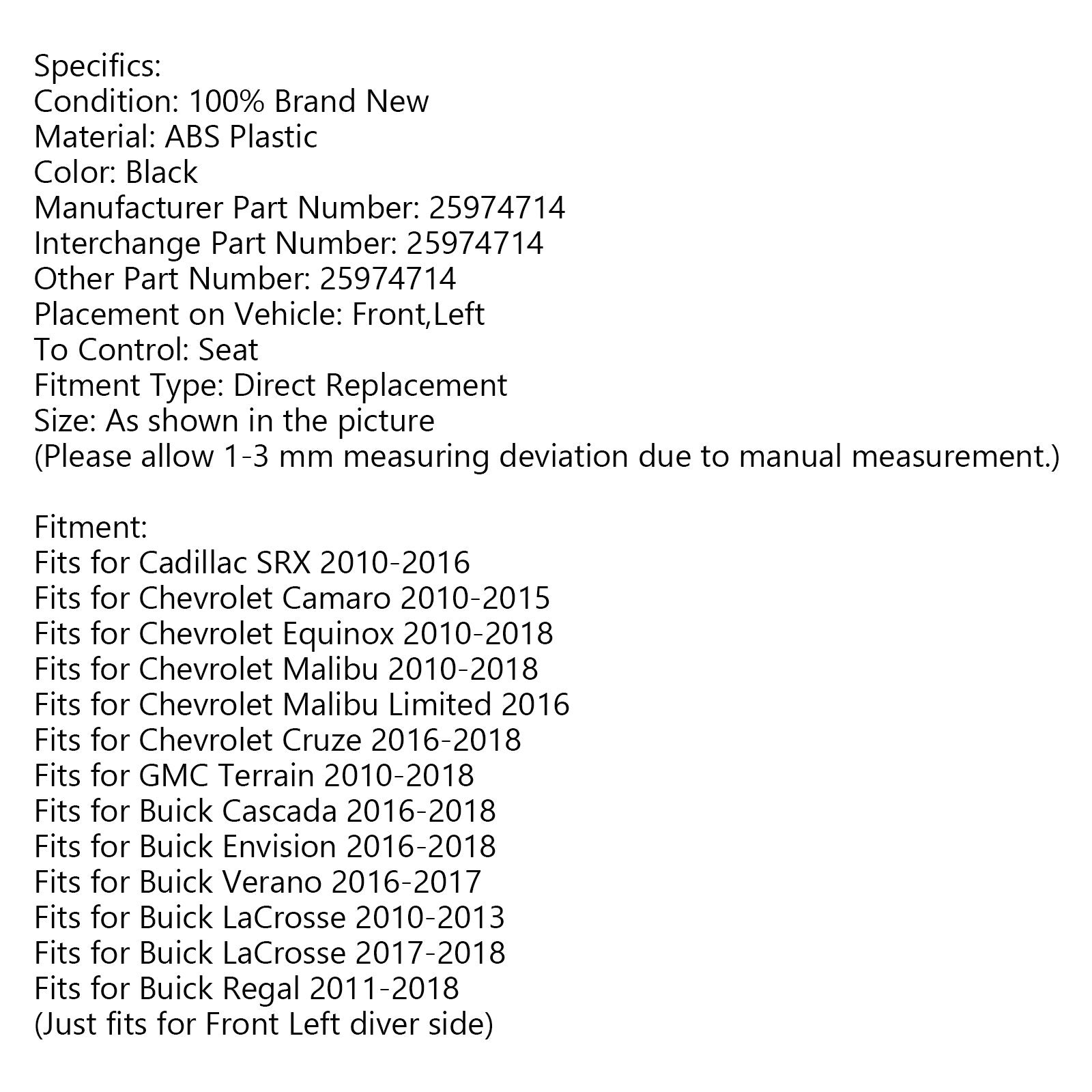 Interrupteur de siège électrique côté conducteur gauche 25974714 pour Chevrolet Camaro Cruze SRX 2010-2015