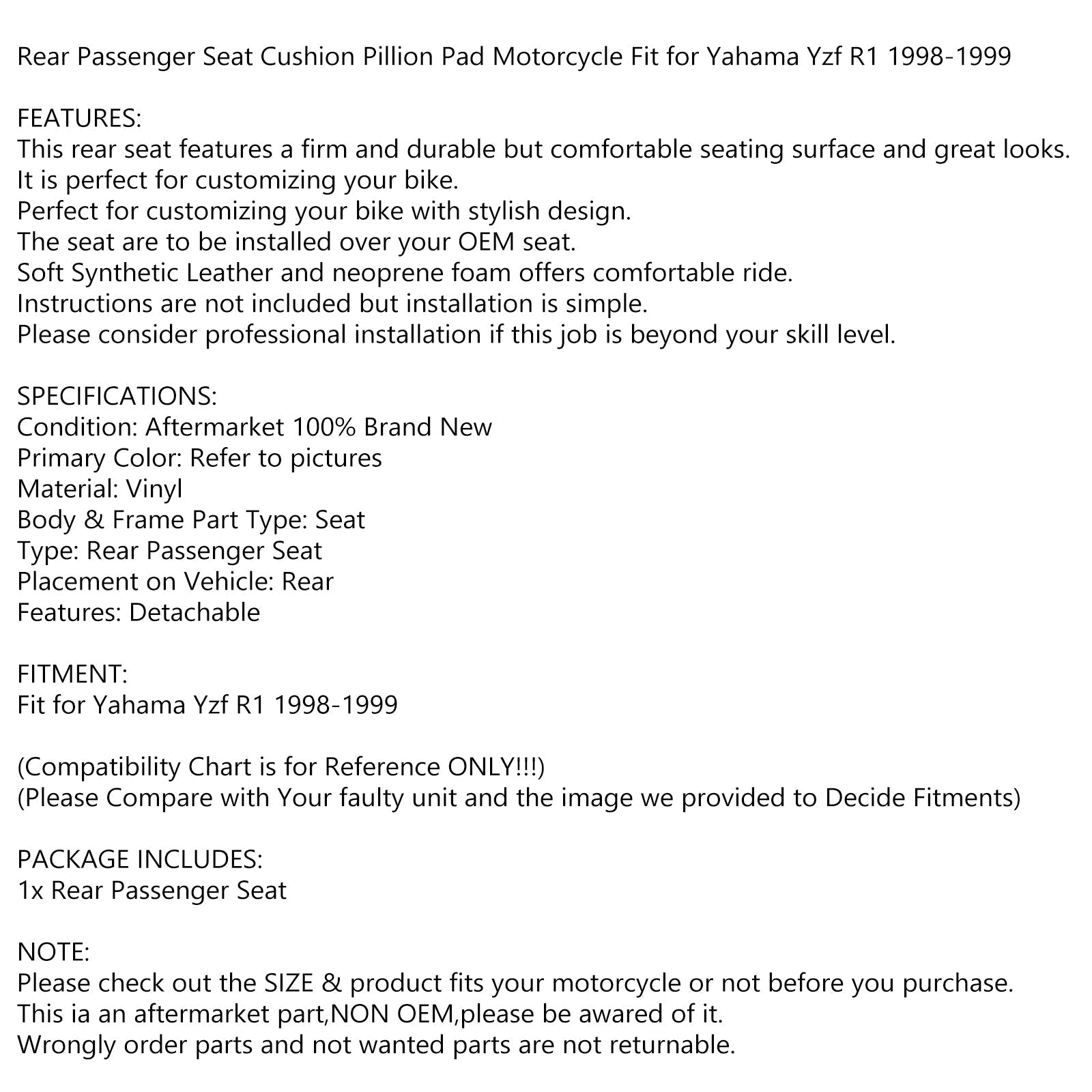 Selle de siège passager arrière pour Yamaha YZF-R1 YZF-R1 1998-1999