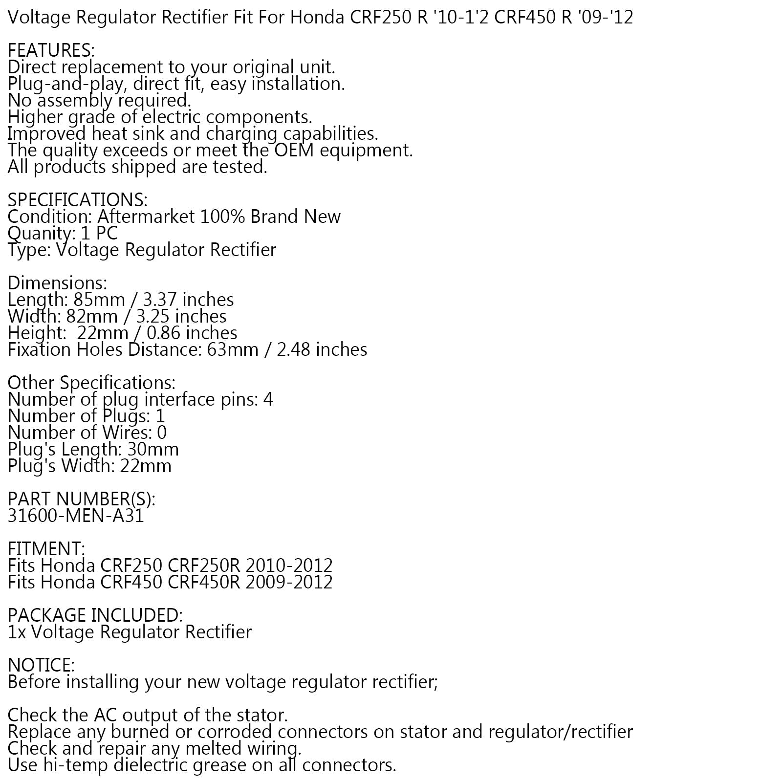 Régulateur redresseur pour Honda CRF250 R 2010-12 CRF450 R 09-2012 31600-MEN-A31