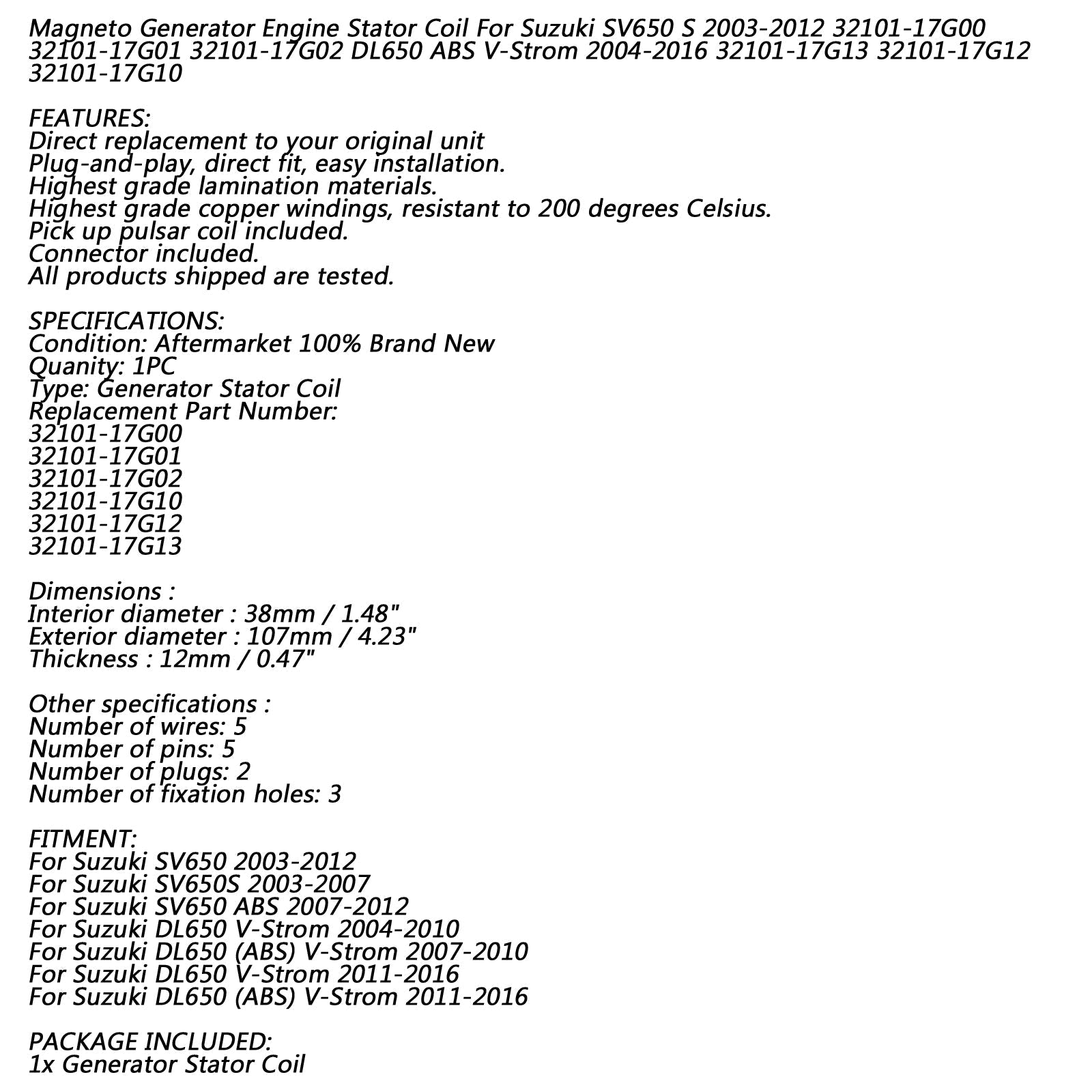 Bobine de stator 18 pôles pour Suzuki SV650 S ABS 03-12 DL650 ABS V-Strom 650 04-16 via FedEx