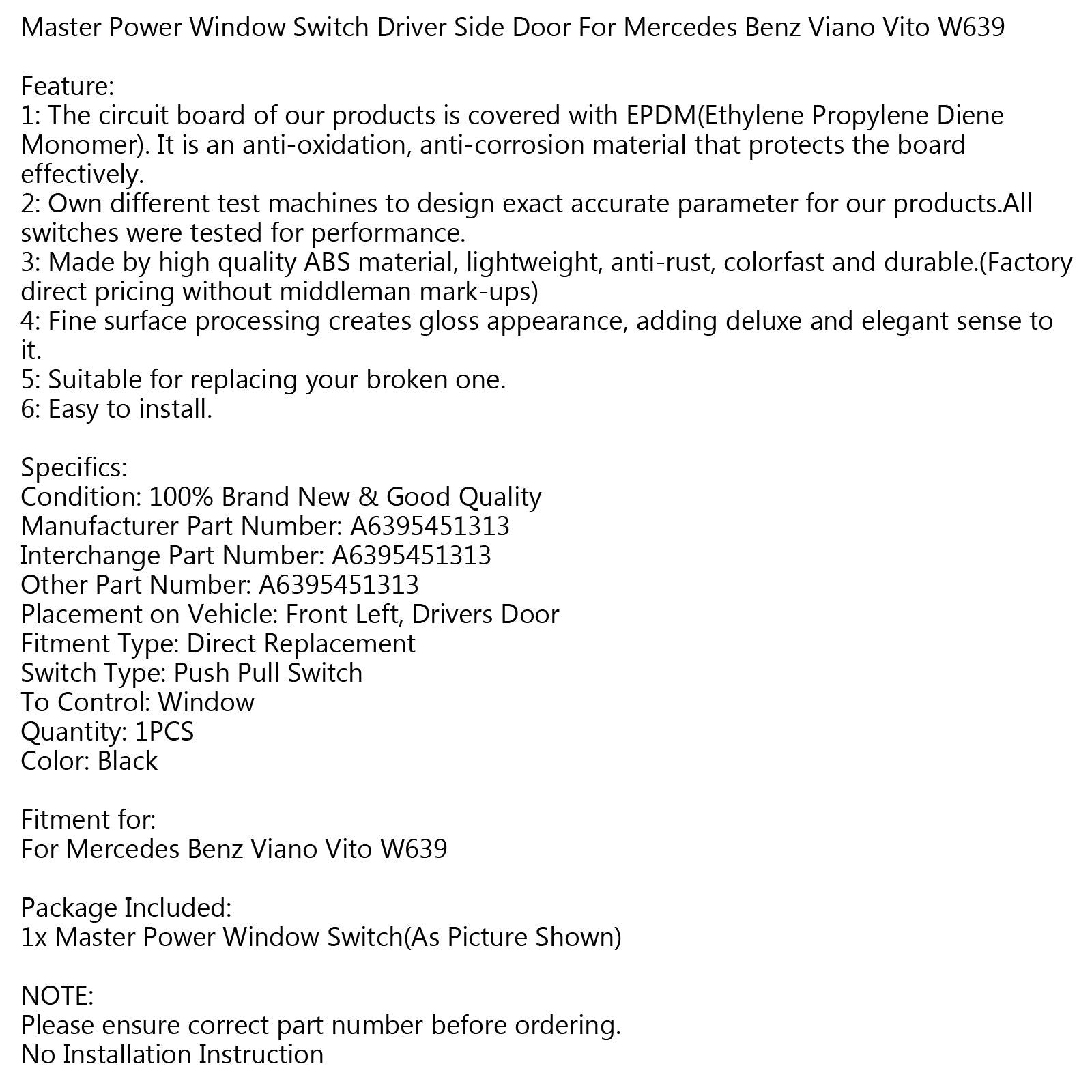 Interrupteur de vitre électrique côté conducteur A6395451313 pour Mercedes Benz Viano Vito W639