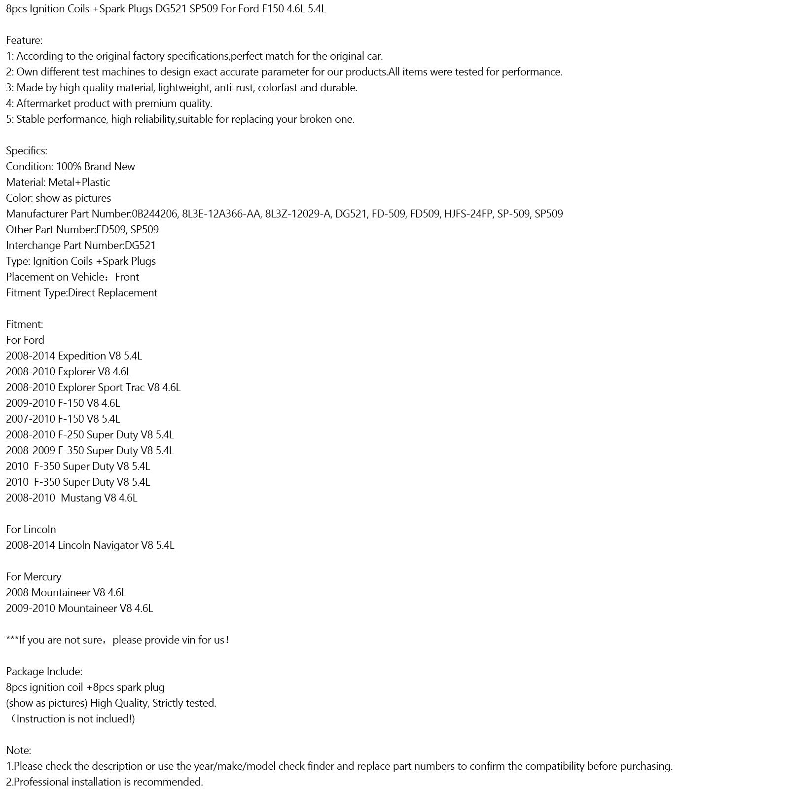 Bobines d'allumage et bougies d'allumage pour F-350 Super Duty V8 5,4 L 2010 (8 pièces) DG521 SP509