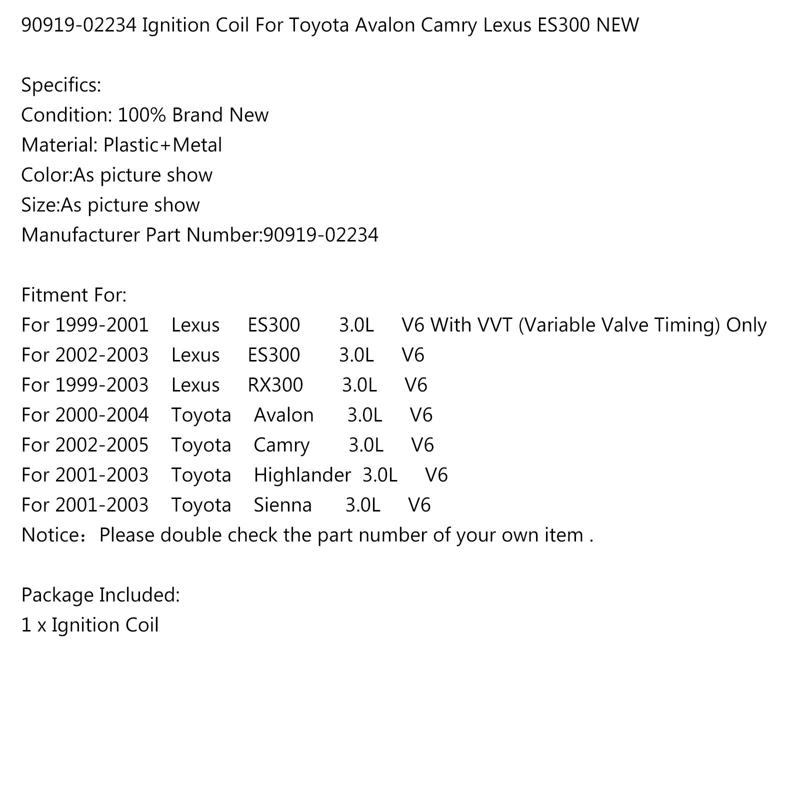 Bobine d'allumage 90919-02234 pour Toyota Avalon Camry Lexus ES300 NEUF