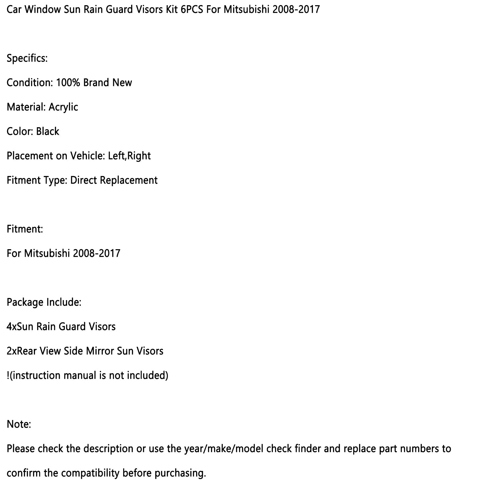 Kit de 6 pare-soleil et pare-pluie pour vitres de voiture, pour Mitsubishi Lancer 2008-2017