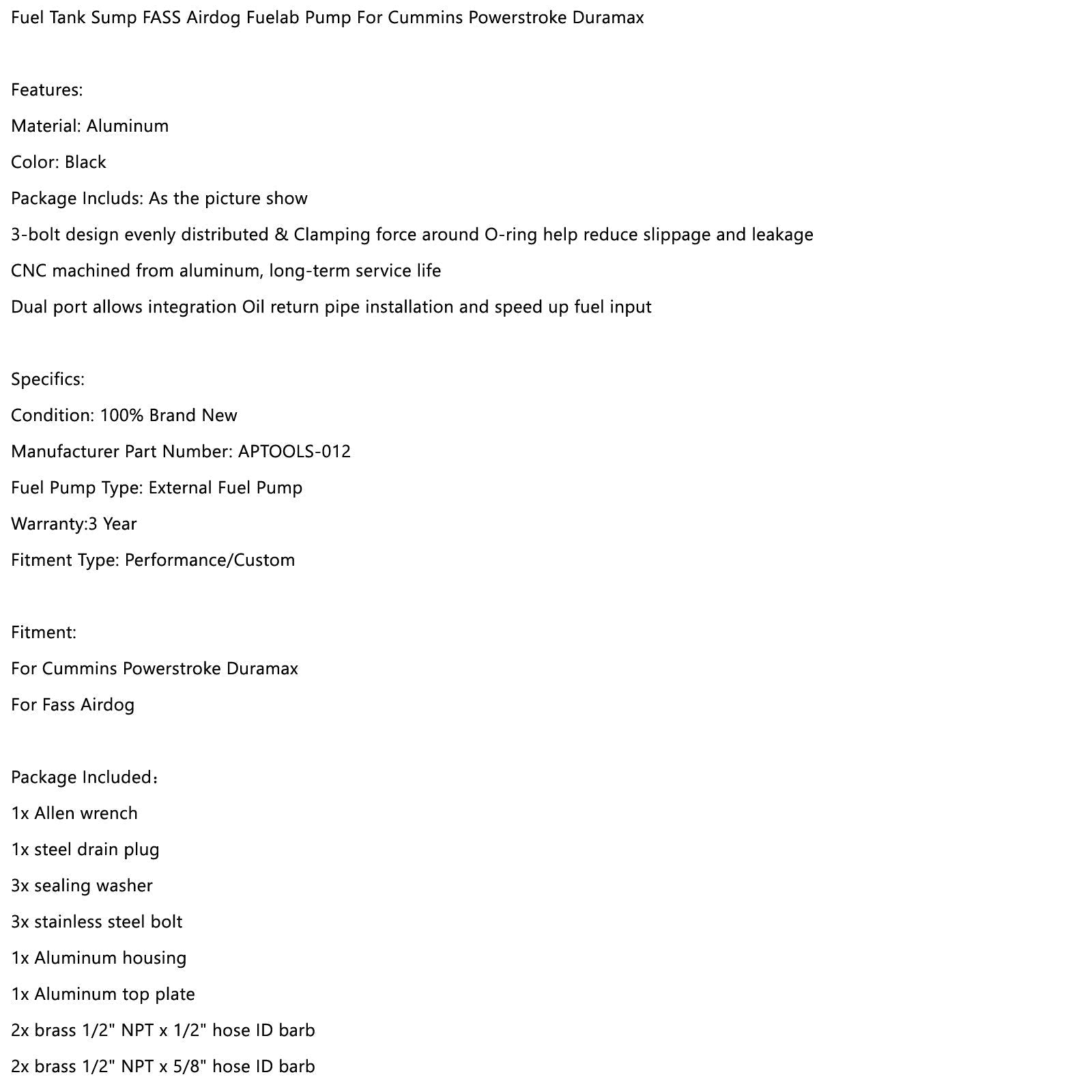 Carter de réservoir de carburant FASS Airdog Fuelab Pump APTOOLS-012 Compatible avec Cummins Powerstroke Duramax