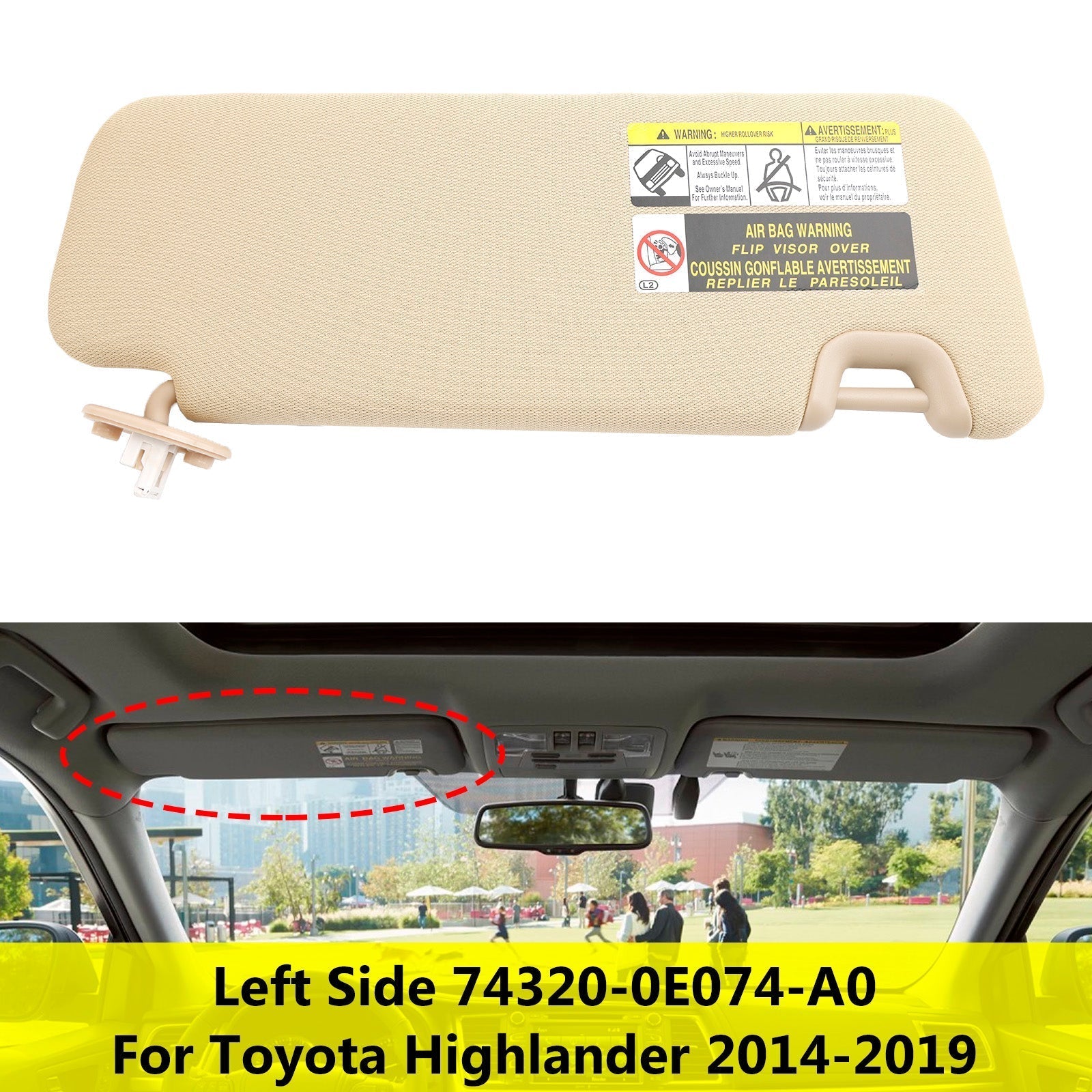 Pare-soleil côté gauche avec éclairage de courtoisie pour Toyota Highlander 2014-2019 74320-0E074-A0