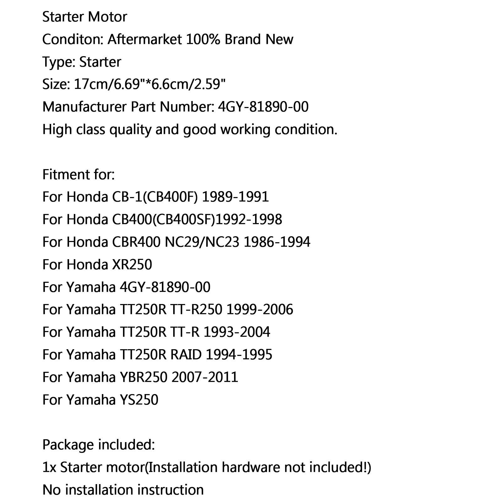 Démarreur de moteur pour Honda CB-1 CB400F 89-91 CB400 92-98 CBR400 NC29 XR250 86-94