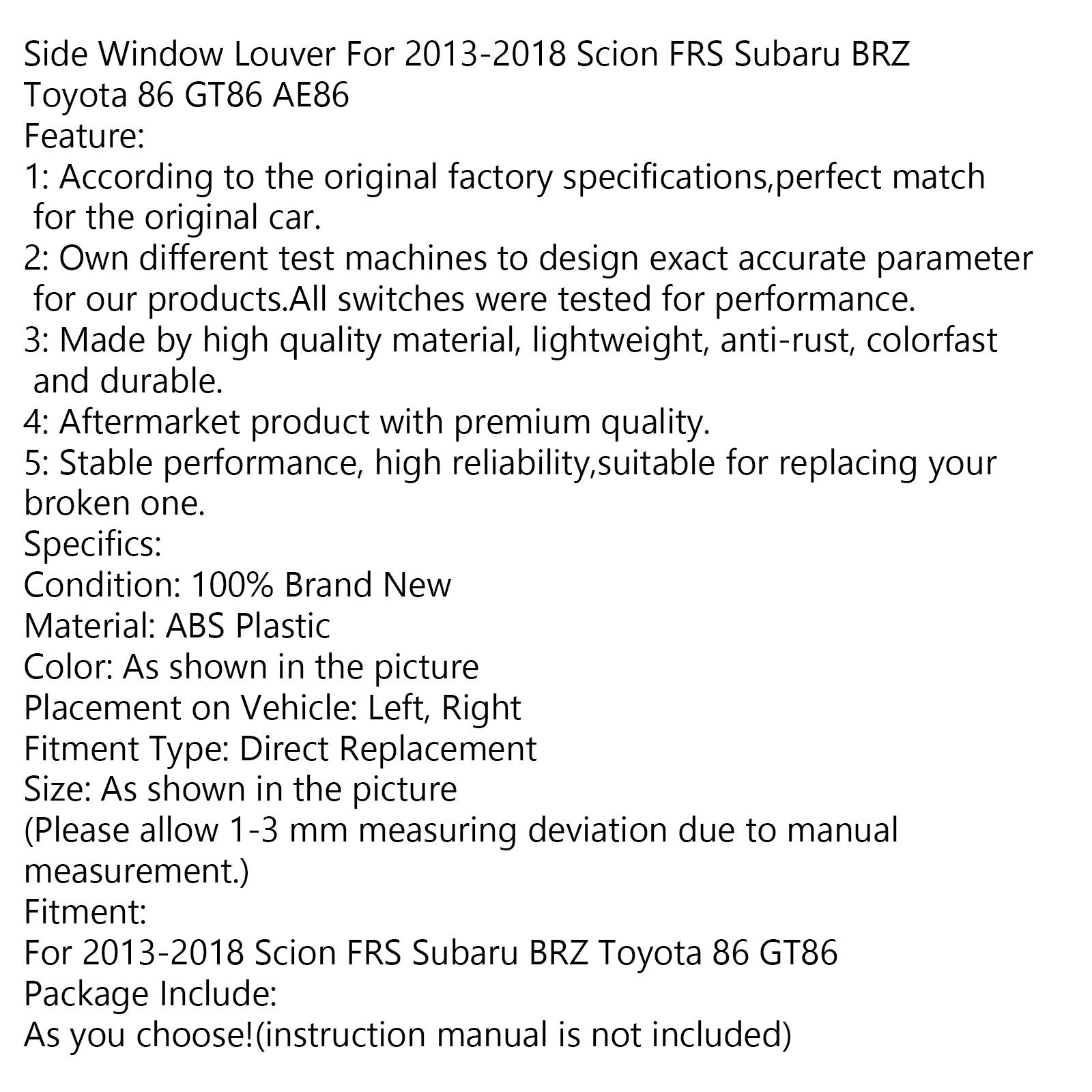 Persienne de fenêtre latérale pour Scion FRS Subaru BRZ Toyota 86 GT86 AE86 2013-2018