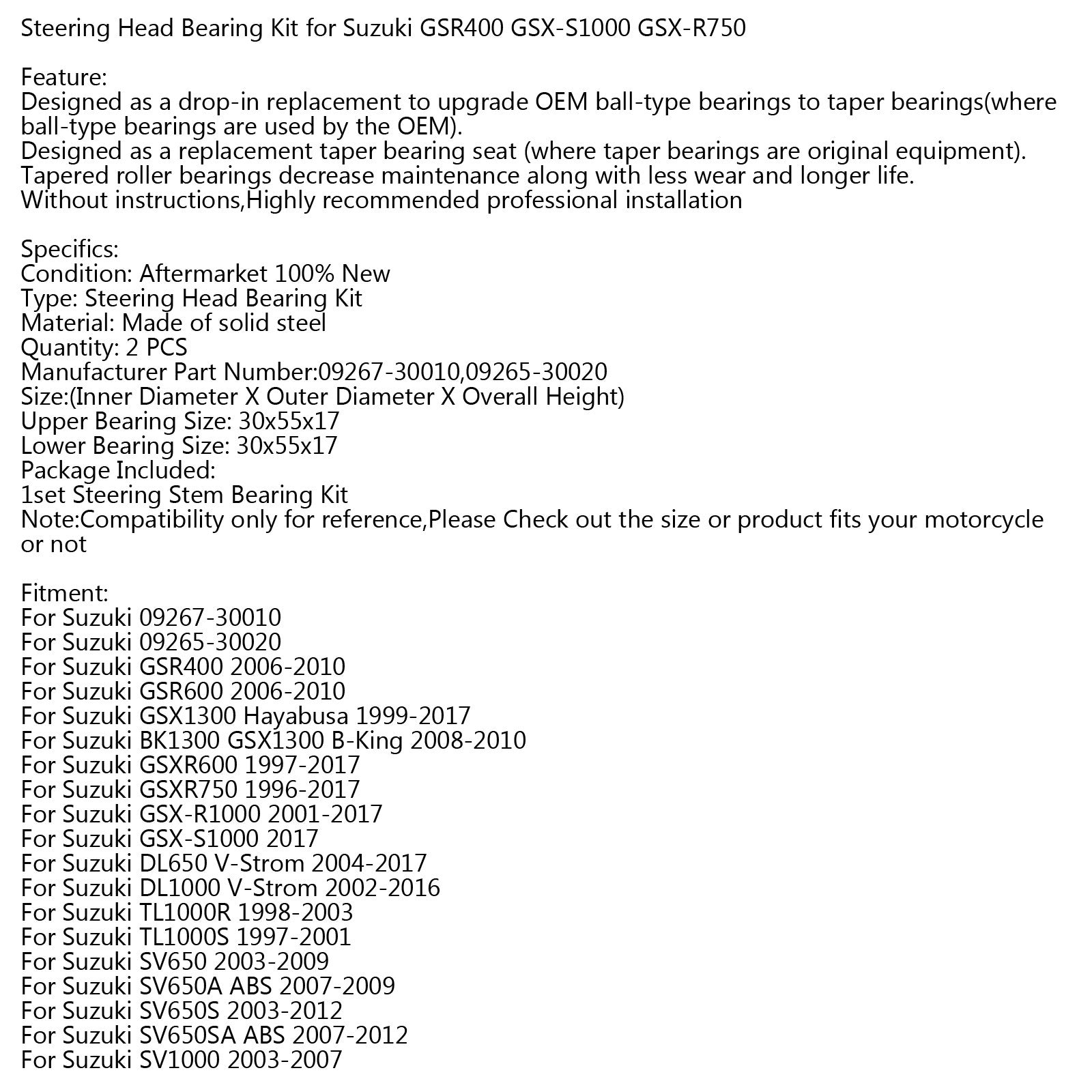 Kit de roulements de direction pour Suzuki GSR400 GSX-S1000 GSX-R750
