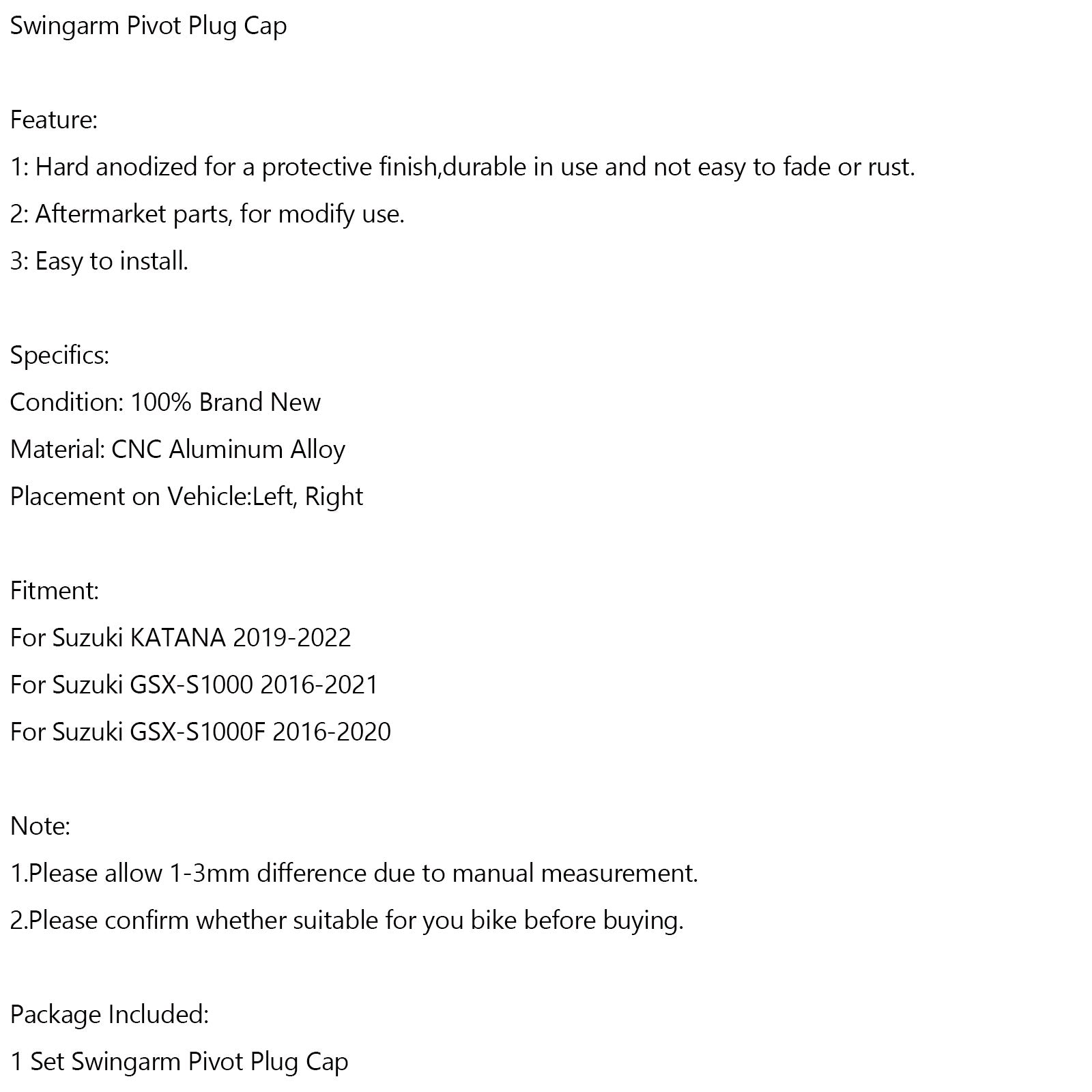 Bouchon de pivot de bras oscillant pour Suzuki Katana GSX-S1000 GSX-S1000F 2016-2021