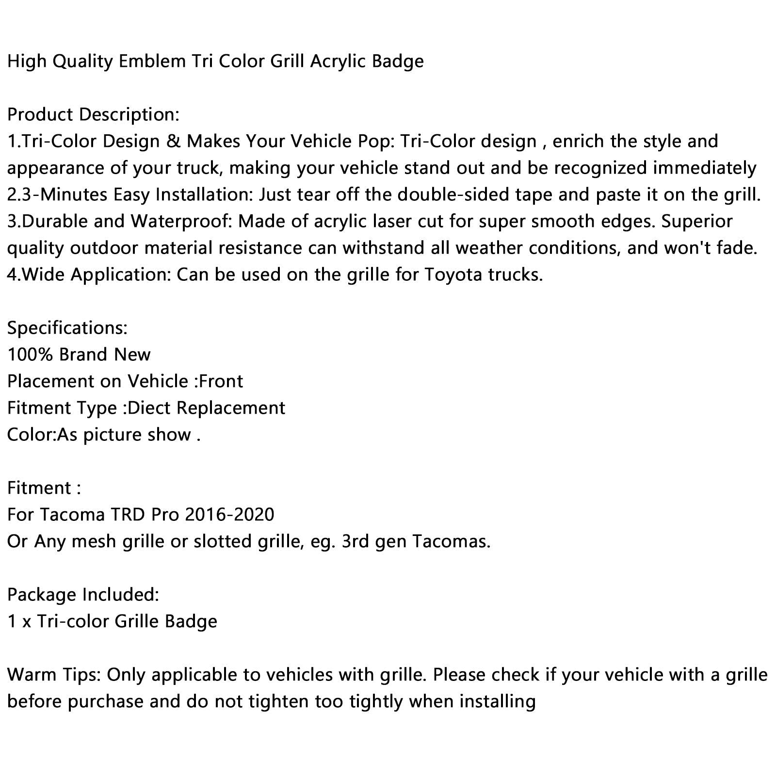 Autocollant de calandre avant tricolore pour Tacoma TRD Pro 2016-2020