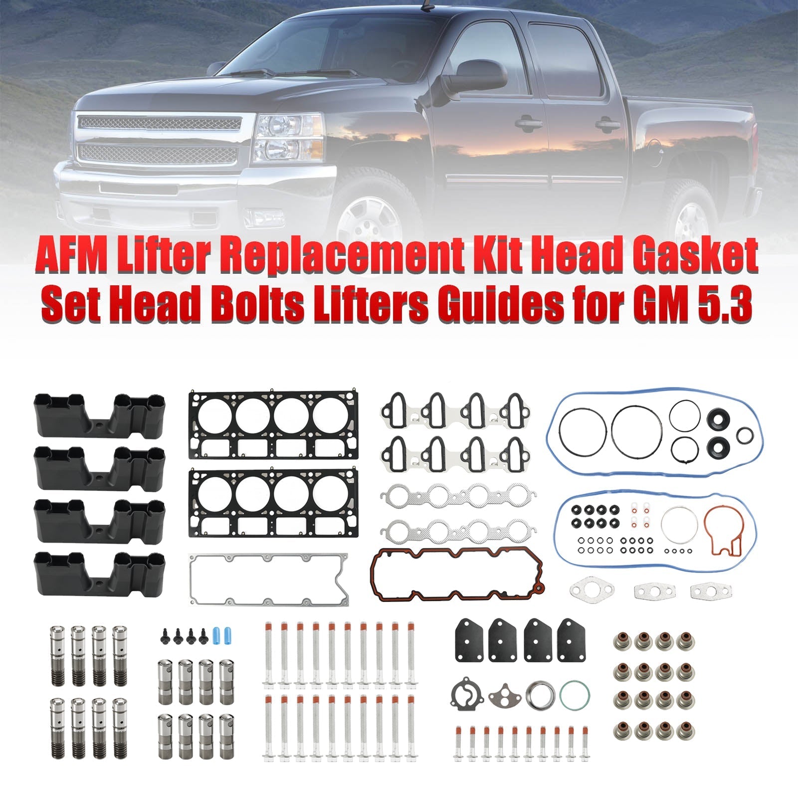 GM 5.3 AFM Lifter Replacement Kit Head Gasket Set, Head Bolts Lifters and Guides. The hydraulic lifter in a car's engine uses oil pressure to adjust a plunger and take up all the clearance in the valve train. This helps to ensure less engine noise and longer reliability, due to less wear and tear. Hydraulic lifters can begin to fail through normal use of a vehicle. After several years of running the engine of your vehicle, the hydraulic lifters within the valves can become laden with sludge, and other contaminants in the valve, that they start to wear out. New hydraulic lifters can make a tremendous difference in the way that a vehicle runs as well as how the engine sounds. The head gasket is the key component of the engine. It is compressed between the engine block and the cylinder head. The head gasket seals in the internal combustion process to make sure maximum compression is achieved and also keeps coolant and oil from mixing together as the two fluids travel from the engine block to the cylinder head. Therefore the cylinder head gasket, and lifters are an important part of your engine. They should always be in perfect condition and should be maintained properly. So, if you notice that this part is showing signs of excessive wear, have them replaced immediately. Be sure to have your worn out parts replace with our aftermarket replacement parts set as soon as they start to give you trouble.