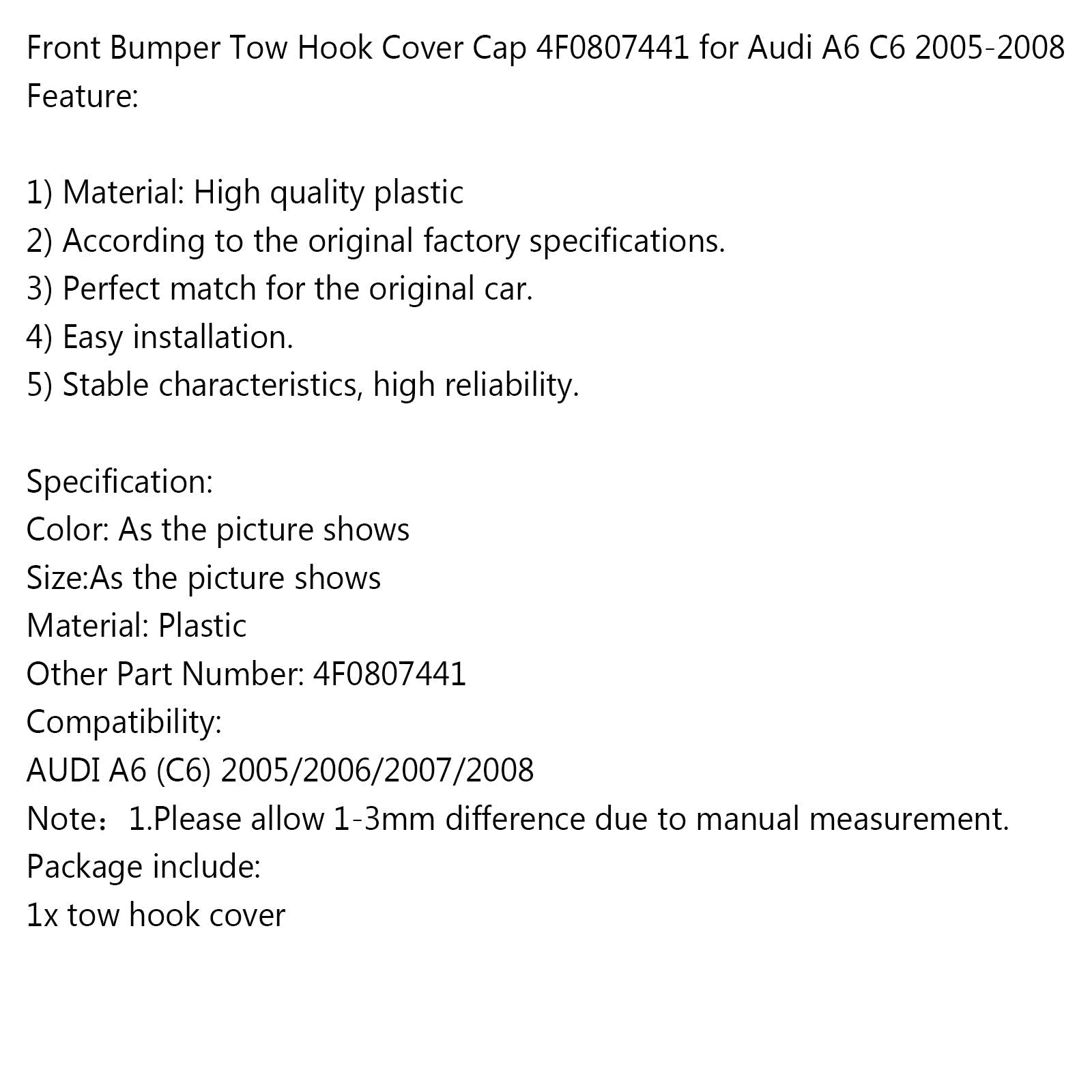 Front Bumper Tow Hook Cover Cap 4F0807441 for Audi A6 C6 2005-2008