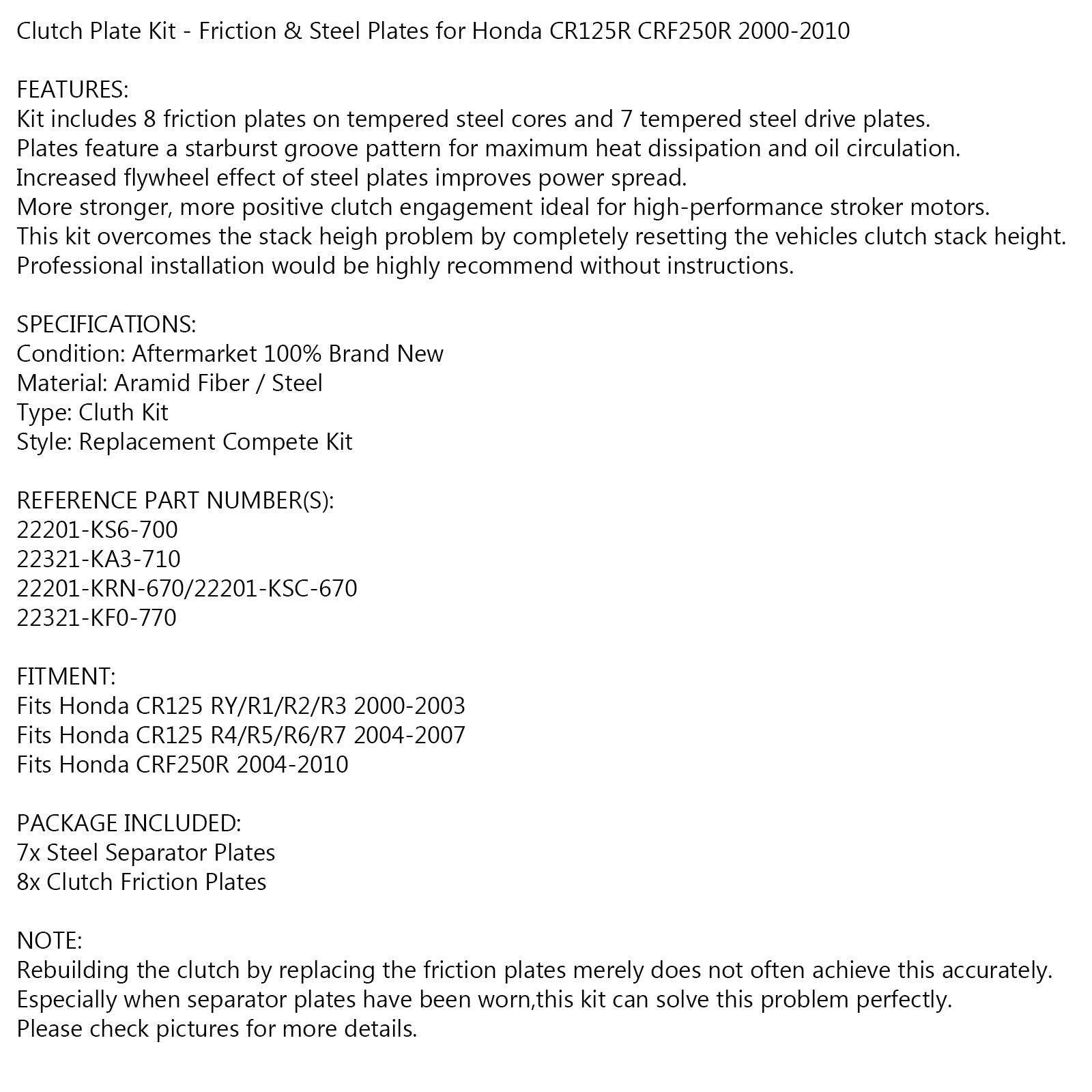 Clutch Kit Steel & Friction Plates for Honda CR 125 R CRF 250 R 2000-2010
