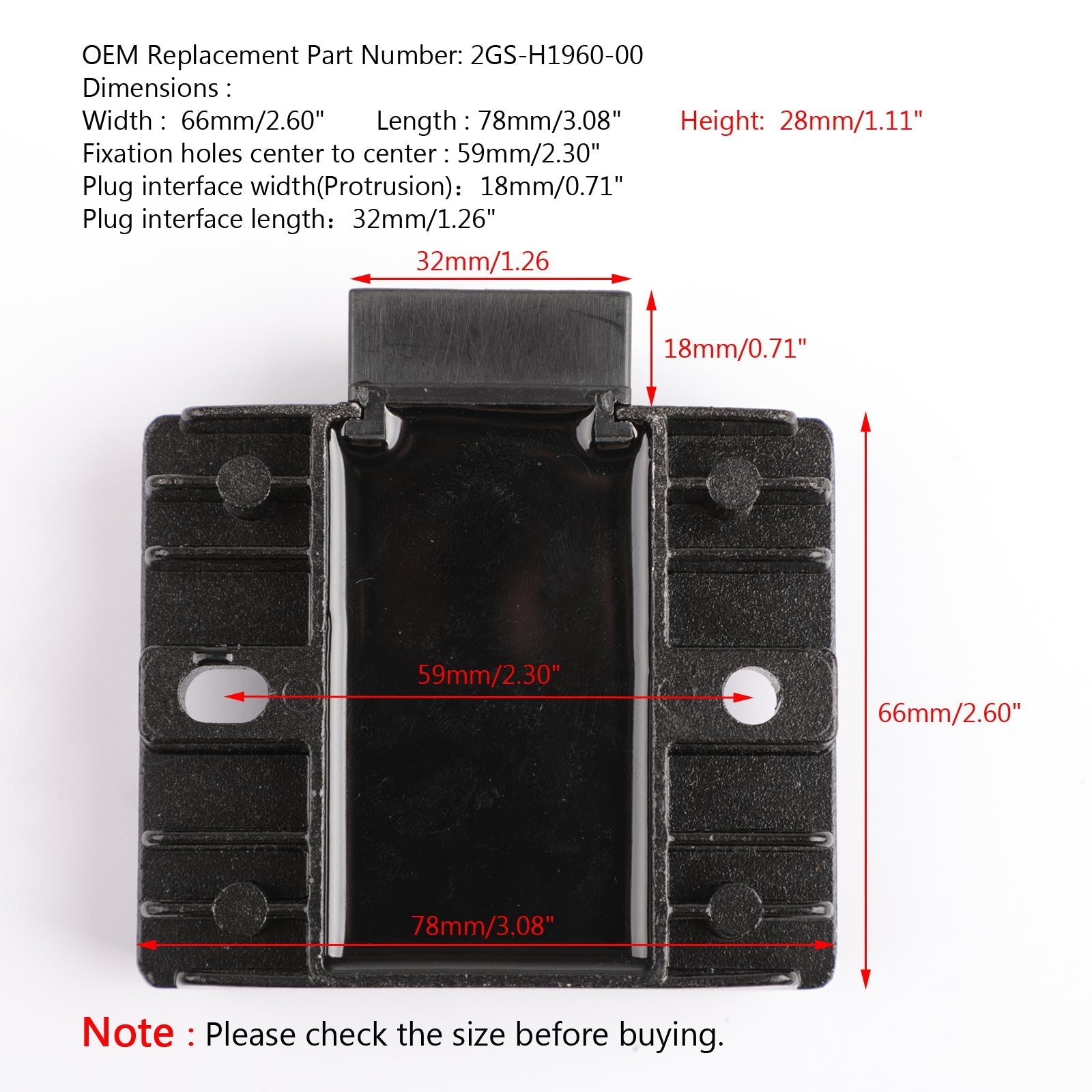 Voltage Regulator Rectifier For Yamaha YS125 2017 FZ150 2016 FEATURES: SPECIFICATIONS: Dimensions : Plug interface width(Protrusion)??18mm/0.71" FITMENT: PACKAGE INCLUDED: NOTICE: Check the AC output of the stator.