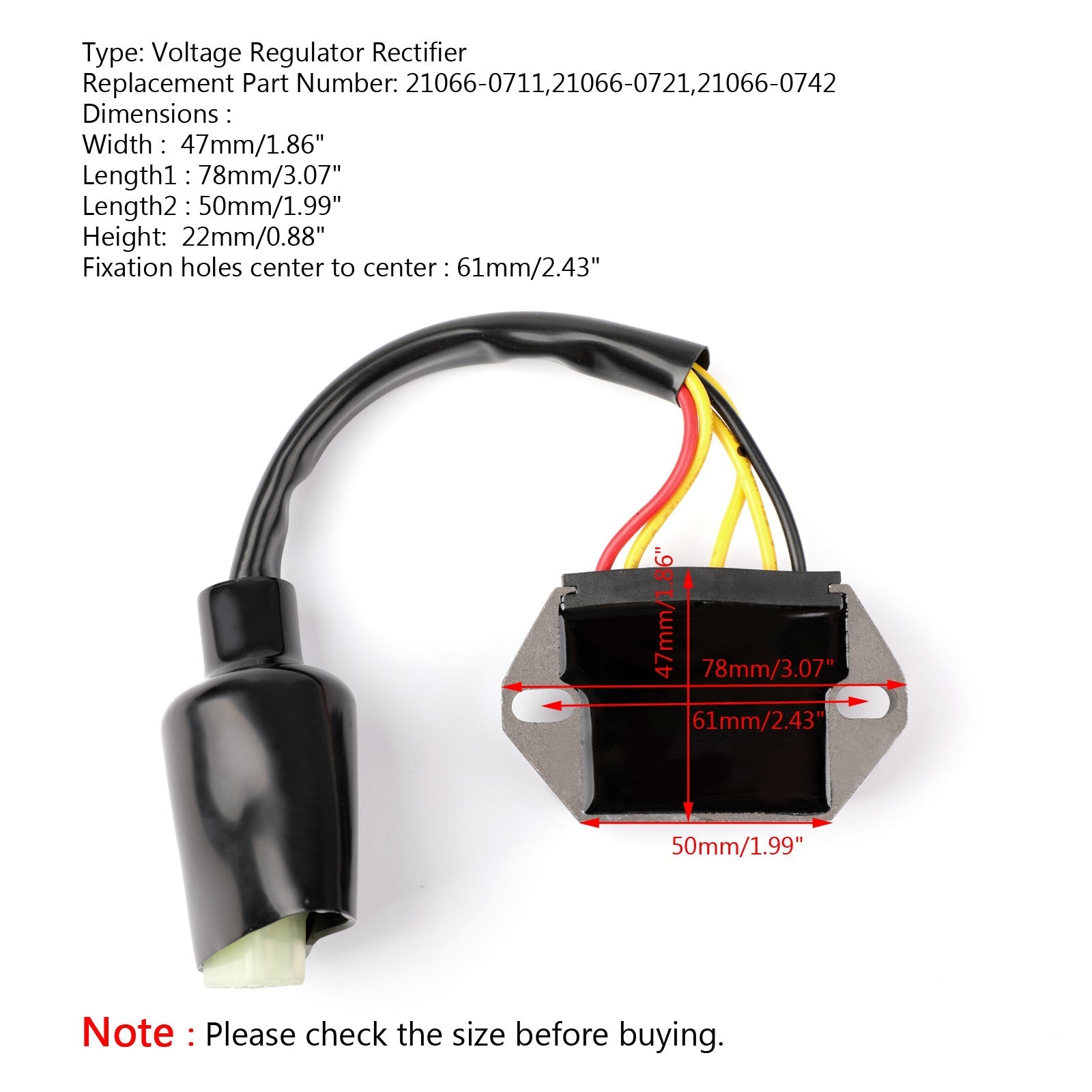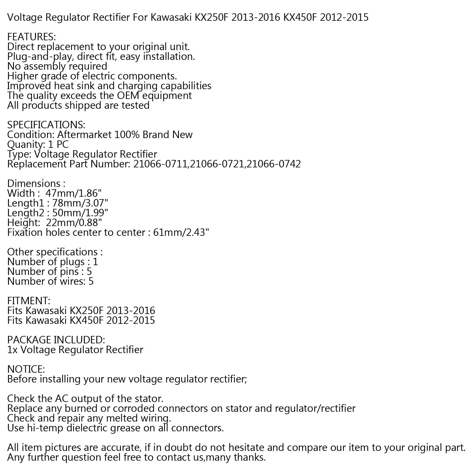 Voltage Regulator Rectifier For Kawasaki KX250F 2013-2016 KX450F 2012-2015 FEATURES: SPECIFICATIONS: Dimensions : Other specifications : FITMENT: PACKAGE INCLUDED: NOTICE: Check the AC output of the stator. All item pictures are accurate, if in doubt do not hesitate and compare our item to your original part.