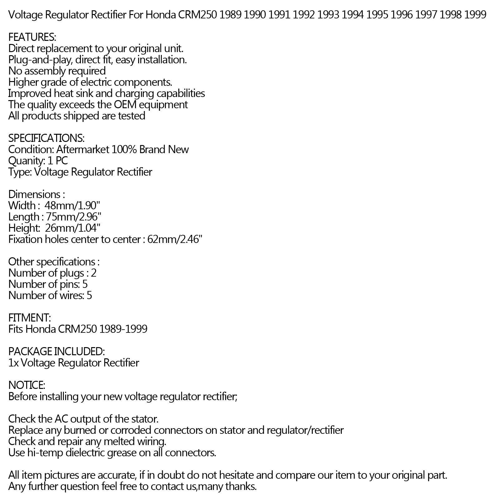 Voltage Regulator Rectifier For Honda CRM250 1989 1990 1991 1992 1993 1994 1995 1996 1997 1998 1999 FEATURES: SPECIFICATIONS: Dimensions : Other specifications : FITMENT: PACKAGE INCLUDED: NOTICE: Check the AC output of the stator. All item pictures are accurate, if in doubt do not hesitate and compare our item to your original part.